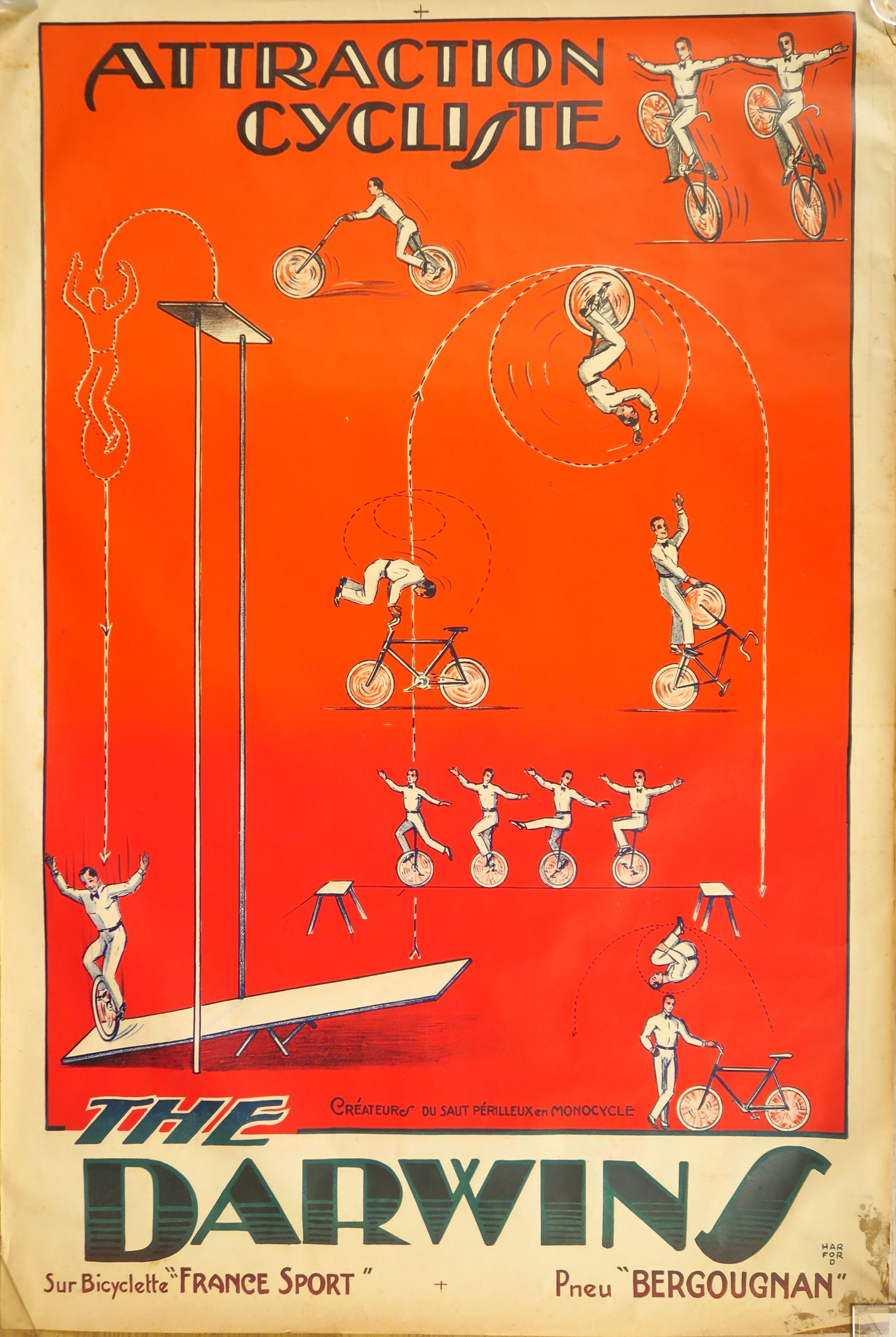 Affiche DARWINS "Attraction cycliste" 120 x 80 cm (quelques piqûres, tâches et très légères déchirures en bordures)