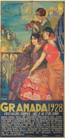 Affiche espagnole 1928 'Granada Fiestas del Corpus Christi'. Par J. Carazo. 195 x 94 cm