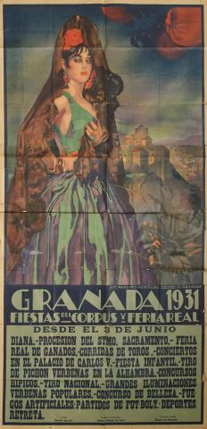 Affiche espagnole 1931 'Granada Fiestas del Corpus Chrsti' par J. Carazo (déchirée en deux). 195 x 94 cm