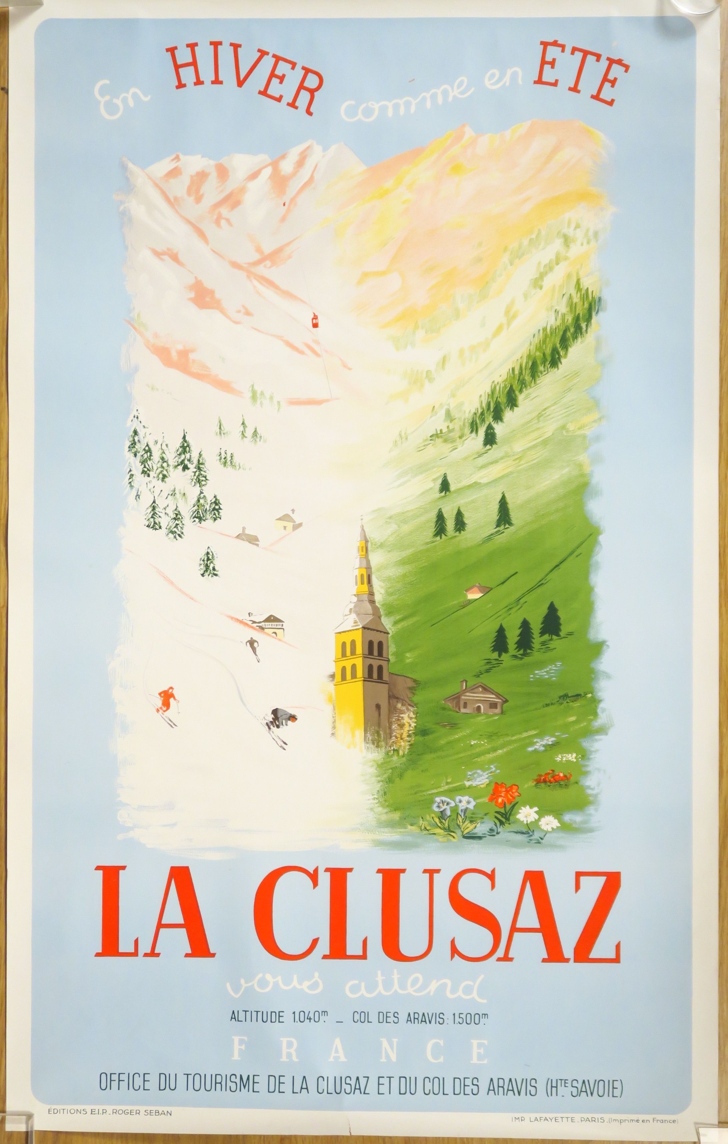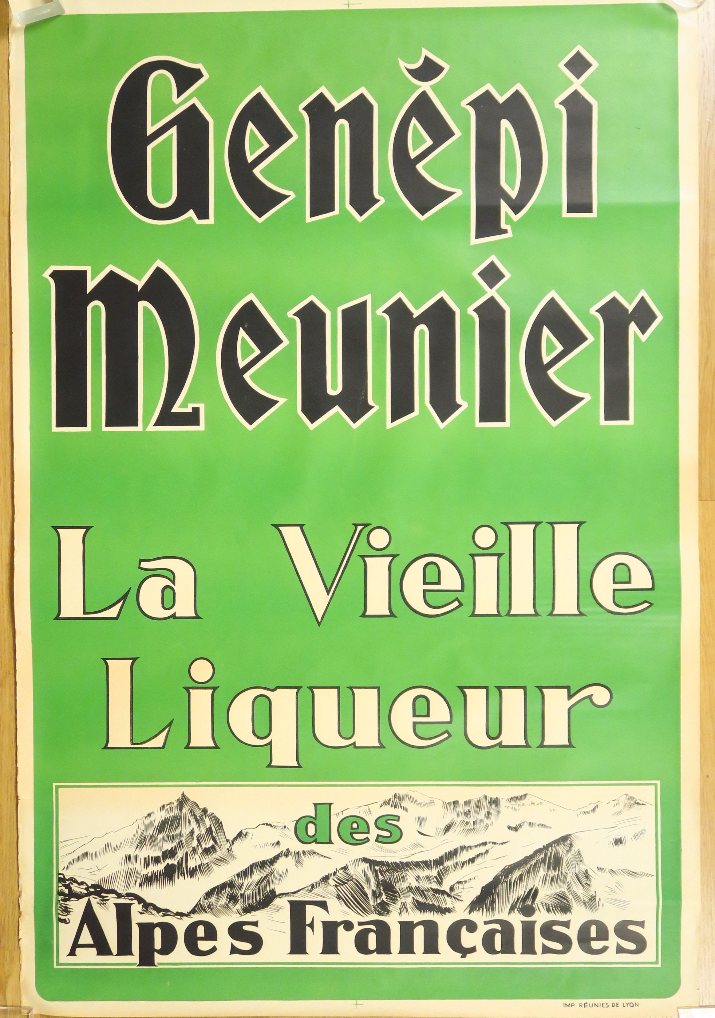 Affiche Genépi Meunier "La vieille liqueur des Alpes Françaises". Imp. Reunies de Lyon. 120 x 80 cm (très légère déchirure sur l'un des bords). On y joint une affiche de l'office du tourisme de La Clusaz et du Col des Aravis (Haute-Savoie). Editions E.I.P - Roger Seban. Imp. Lafayette Paris. 100 x 62 cm