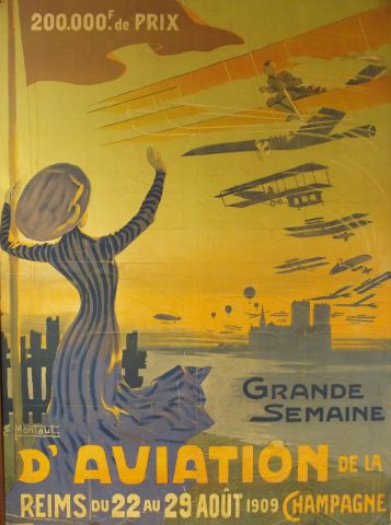 Eugène MONTAUT, " Grande semaine d'aviation de la Champagne 1909 ". Affiche marouflée sur panneau (accidents). 156 x 112cm