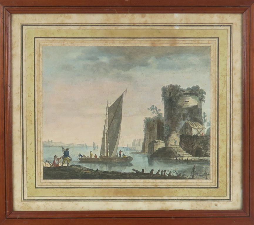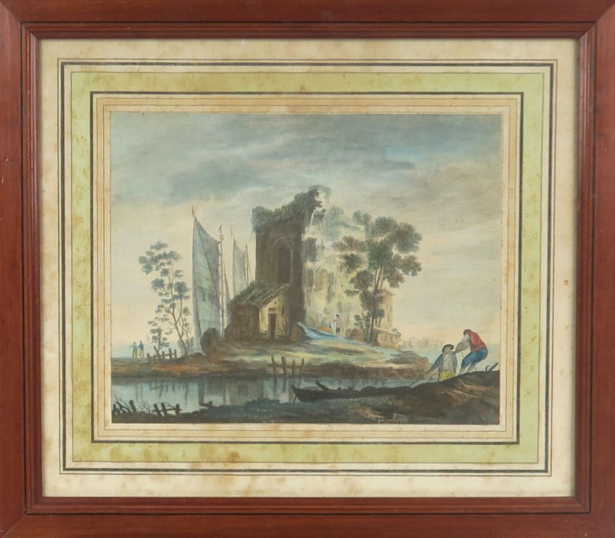 Gravure en couleurs XIXème par Wizani. "vue du moulin dit Buschmuhle dans la vallée de Plauen près de Dresde" On y joint 3 gravures début XIXème en couleurs. "paysages aux ruines" dans des cadres en pitch pin fileté