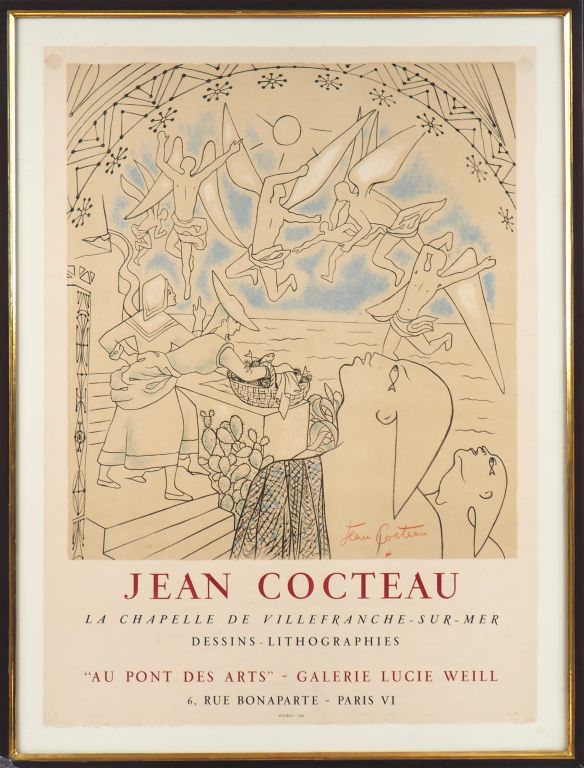 Jean COCTEAU. Affiche lithographique de l'exposition Jean Cocteau Galerie Lucie WEILL "au pont des Arts" Imprimée chez Mourleau en 1957 Monogrammée LD en bas à droite Dim. 66 x 47,5 cm