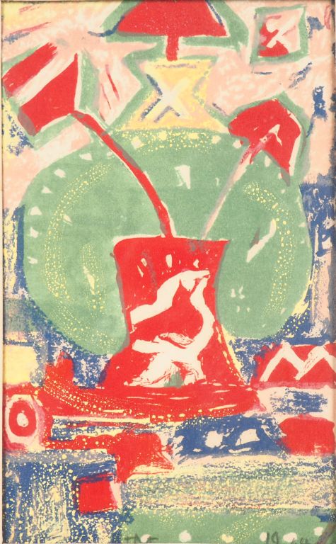 Lithographie en couleur, "Composition abstraite", dans son cadre en bois peint