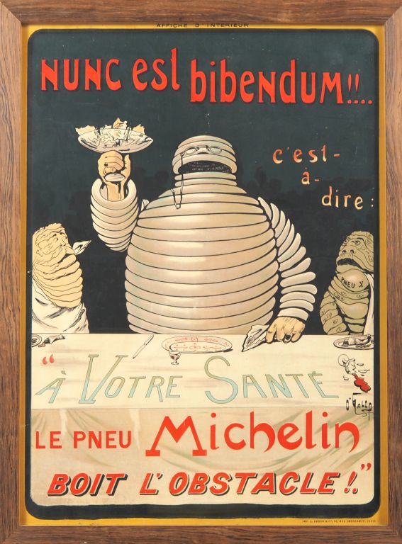 O' GALOP. Affiche d'intérieur 'nunc est bibendum c’est-à-dire : à votre santé le pneu Michelin boit l'obstacle". Dim. 47,5 X 34,5 cm Imprimée chez L. REVON rue Oberkampf Paris.