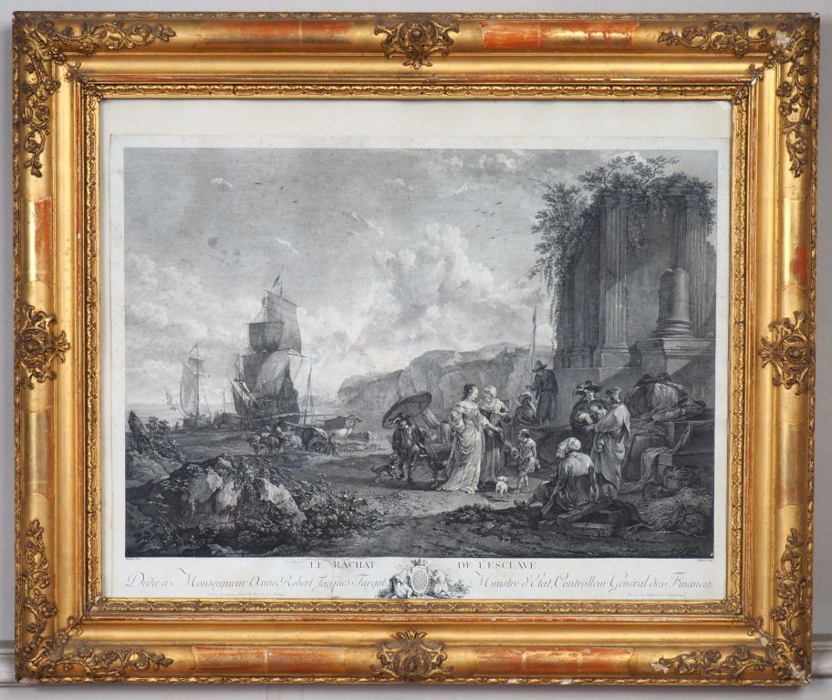 Paire de gravures en noir d’après Berghem, « l’ancien port de Gènes » et « le rachat de l’esclave » dans des cadres XIXème en bois et stuc doré. Dim. 72 x 85 cm (éclats à la dorure)