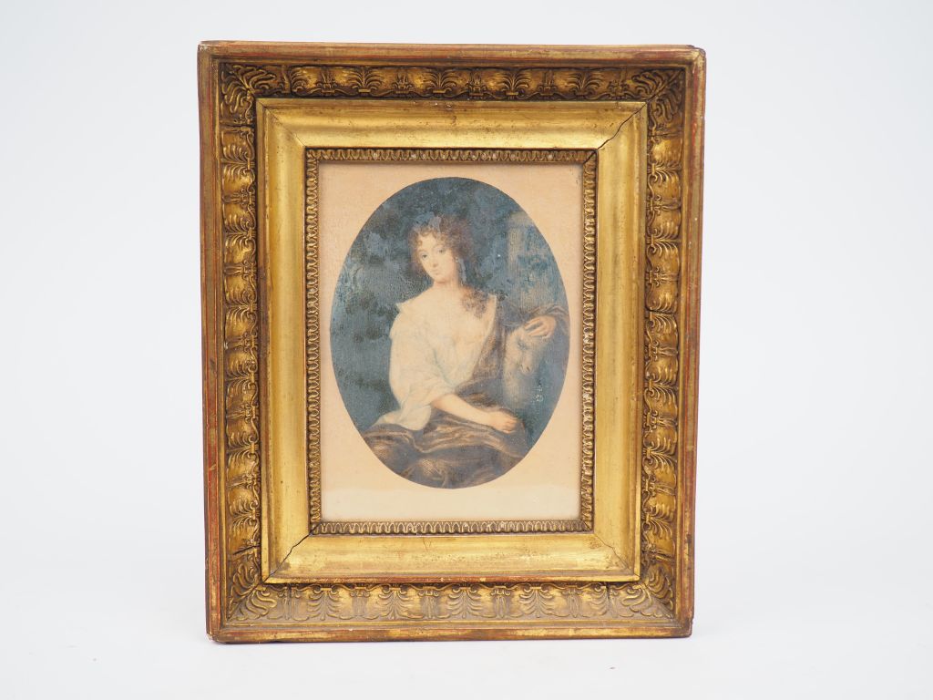 " Portrait de Marianne Deshoulières, poétesse française » Gravure en couleurs. Dans un joli cadre XIXème à palmettes. Dim. du cadre : 29 x 24 cm