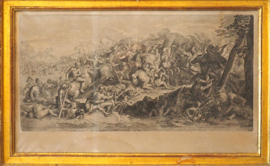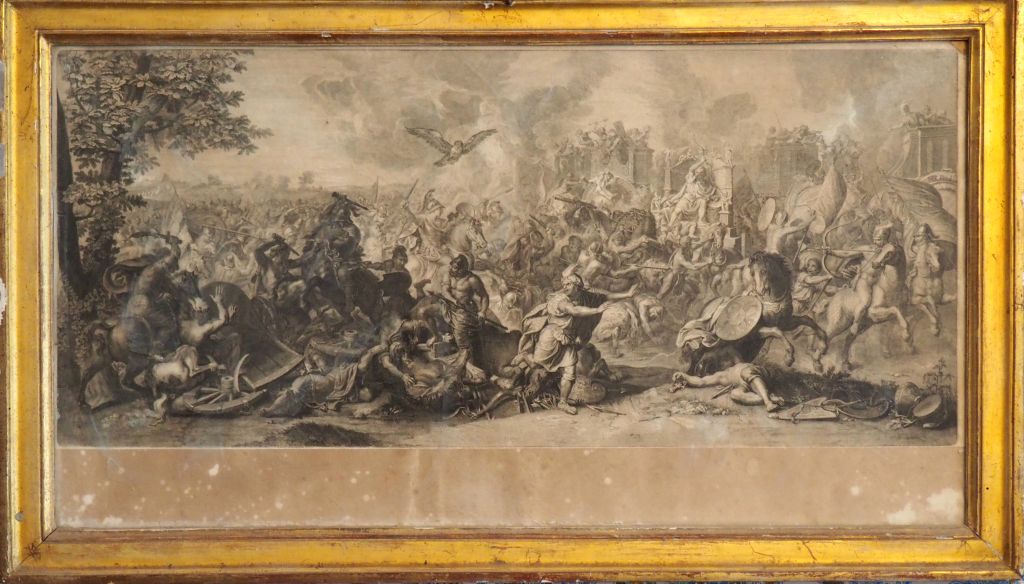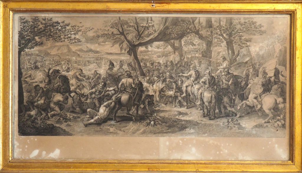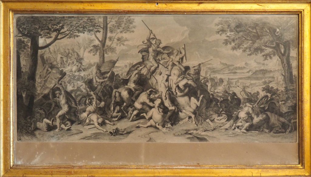 Quatre gravures XVIIème en noir. "scène de bataille » cadres dorés. Dim. 56 x 97,5 cm