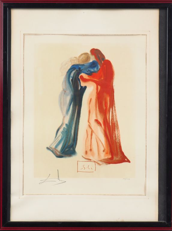 Salvador DALI. "La rencontre de Dante et Béatrice". Lithographie en couleur, contresignée en bas à gauche et numérotée 59/100. Dim. (à vue) : 29 x 22 cm.
