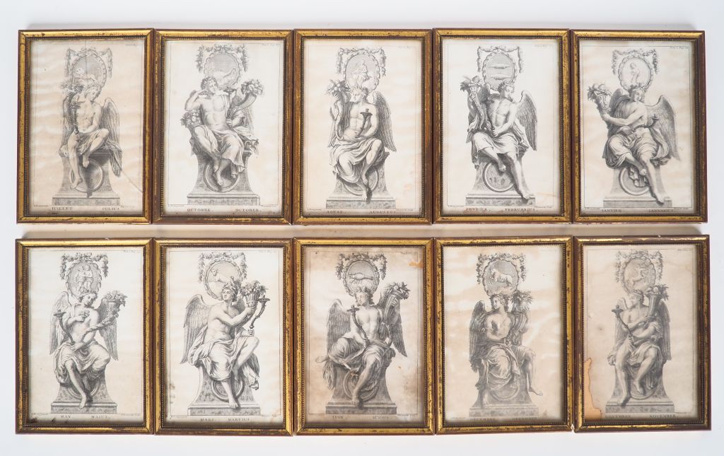 Suite de 10 gravures en noir début XIXème "Allégories des mois". Dim. à vue : 19,5 x 13 cm. (Quelques déchirures).