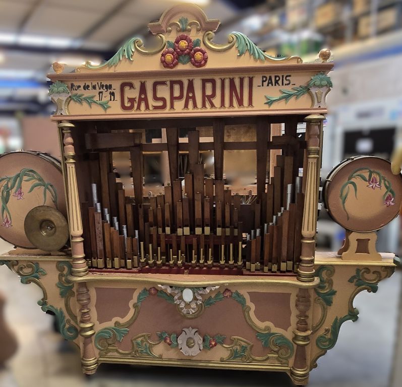 Orgue automatique de manège, 52 touches portant en façade le nom de Gasparini à Paris, dans une façade à console, en bois peint. Cet instrument est reconstruit dans un buffet contemporain et utilise une boite à touches de 52 touches de la maison Gasparini. La composition instrumentale de cet orgue reprend le découpage de la gamme 52 notes Gasparini, particulièrement les basses (7 trombones),l’accompagnement, lechant et le contre-chant. Le sommier est équipé d’électro-aimants qui commandent l’ouverture des soupapes, recevant les informations de contacts positionnés sous les griffes de lecture. Un moteur électrique entraine la rotation du vilebrequin et l’avancée du carton par un ensemble de poulies et courroie. Etat Restauration complète à envisager. Quelques cartons anciens Gasparini. Dimensions : Haut. 2m50 – Larg. 3m – Prof. 0m85 Expert : Philippe Crasse Maître Facteur d’Orgues – Expert de Justice près la Cour d’Appel de Toulouse Agréé par la Chambre Nationale des Experts Spécialisés en Objets d’Art et de Collection – C.N.E.S. Agréé par la Confédération Européenne Des Experts d’Art – C.E.D.E.A. Agréé par le Conseil des Ventes Volontaires sous le N° 2008-658