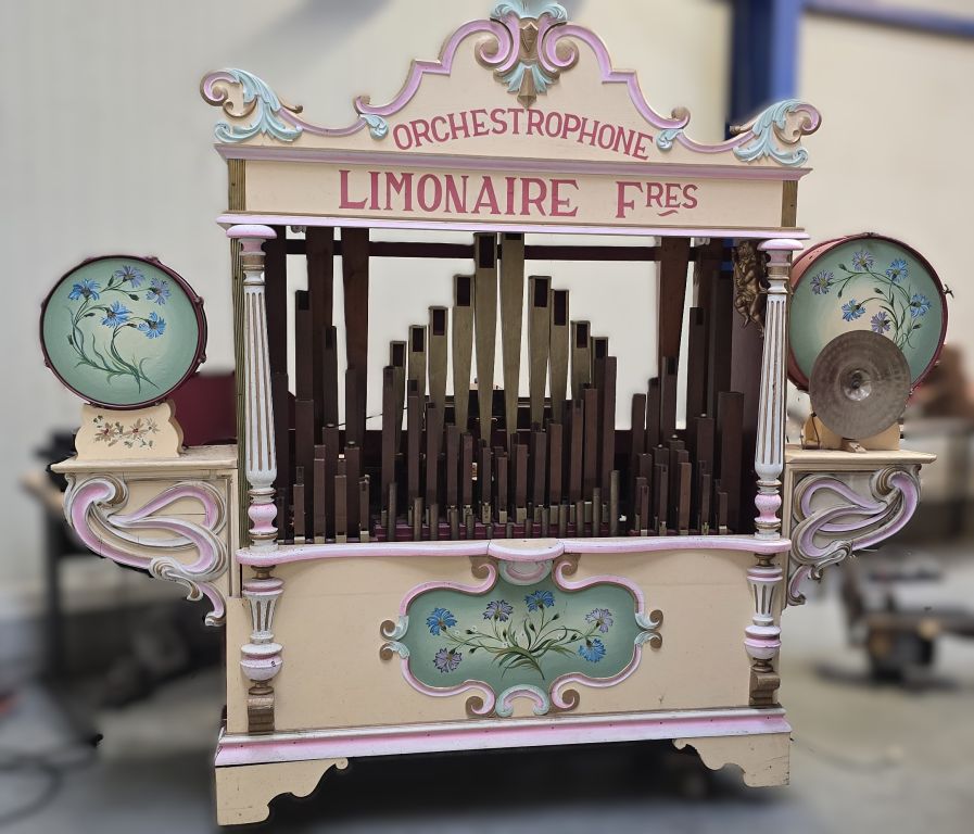 Orgue de foire 49 touches, reconstruit à partir d’éléments anciens d’orgue Limonaire. Encadré par deux consoles sculptées et deux colonnes anciennes (les mécaniques de commande des percussions sont d’origine) le buffet contient la soufflerie à refaire, le sommier reconstruit et la tuyauterie reprenant une partie de la tuyauterie d’origine,particulièrement les 4 trombones basses, les 10 trompettes, les 13 clarinettes, les 10 piccolos doublés et quelques violons et bourdons. Boite à touches exogène, non fonctionnelle. Etat Instrument à reconstruire. Avec quelques cartons. Dimensions: Haut 2m25 - Larg. 2m40 – Prof 0m85 Expert : Philippe Crasse Maître Facteur d’Orgues – Expert de Justice près la Cour d’Appel de Toulouse Agréé par la Chambre Nationale des Experts Spécialisés en Objets d’Art et de Collection – C.N.E.S. Agréé par la Confédération Européenne Des Experts d’Art – C.E.D.E.A. Agréé par le Conseil des Ventes Volontaires sous le N° 2008-658