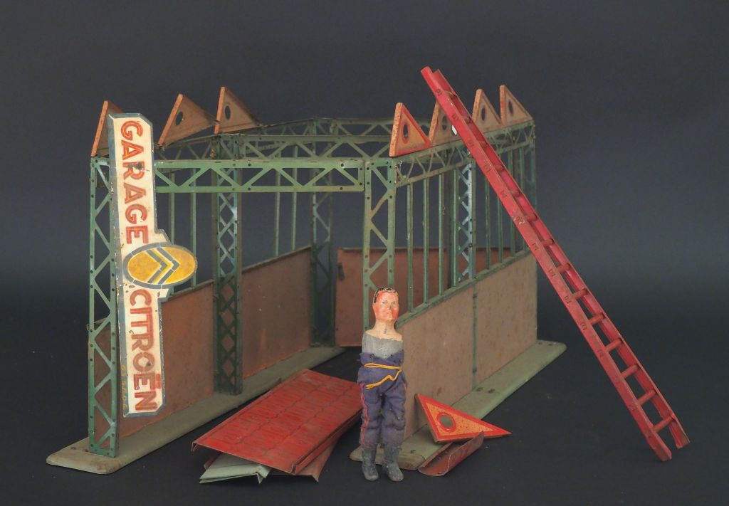 André CITROEN. Garage. Rares pièces en tôle lithographiée. Dim. 31 x 31 x 47 cm (malheureusement incomplet et en mauvais état) On y joint des pièces dont un pompier incomplet Expert : Murielle AUFFRET