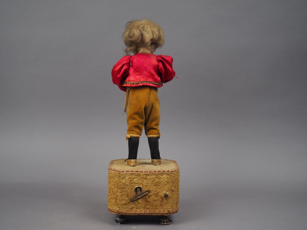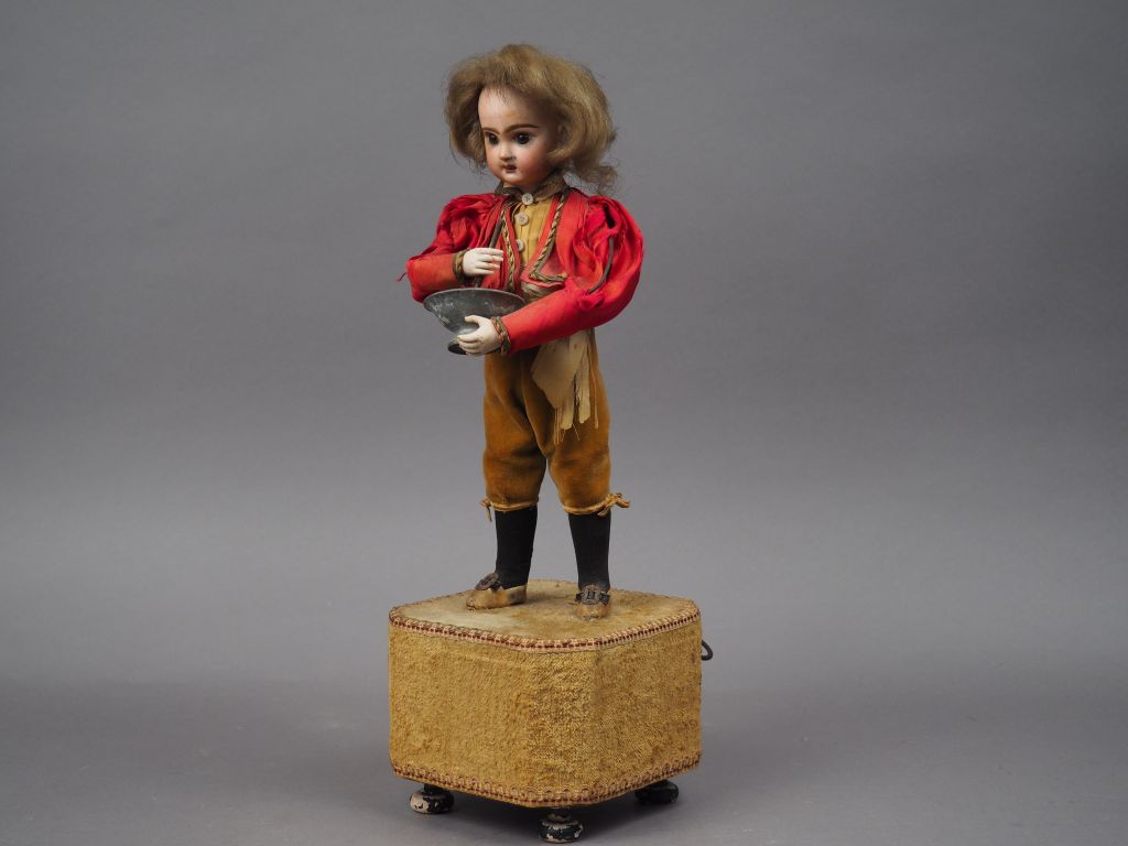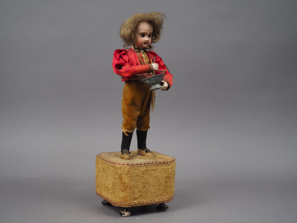 Automate ROULLET-DECAMPS. "Le souffleur de bulles de savon". Vêtements d'origine, tête Jumeau, bouche ouverte avec fels. Musique fonctionnante et mécanisme bloqué. H. 45 cm. Expert : Murielle Auffret - 06 12 04 27 22
