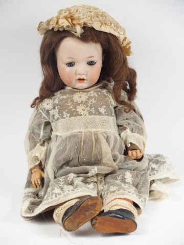 Bébé tête porcelaine marquée Melita 11, yeux basculants bleu, bouche ouverte deux dents, corps de bébé Toddler, en bel état d'usage, vêtements et chaussures en partie anciens, perruque ancienne, mécanisme basculant à revoir. 56 cm