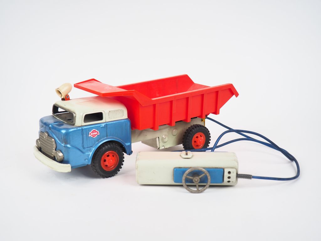 Camion GAMA métal et plastique des années 60 filoguidé (batterie Toys) en état d'usage. Benne basculante. L. 35 cm