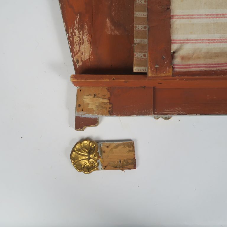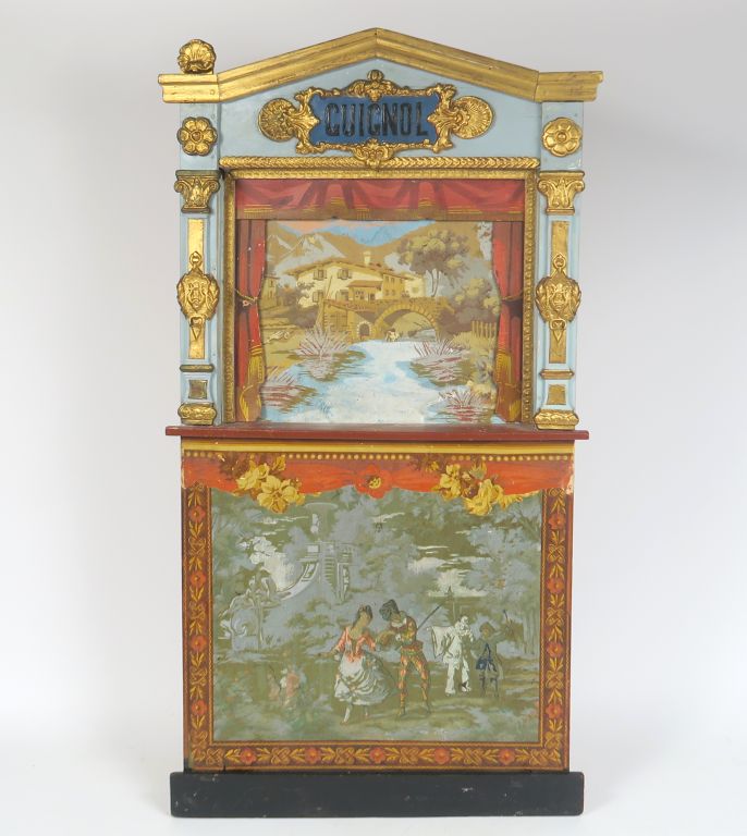 Castelet : théâtre de guignol en bois et composition (quelques restaurations sont à signaler) présence de 3 marionnettes. H. 93 cm