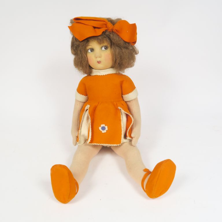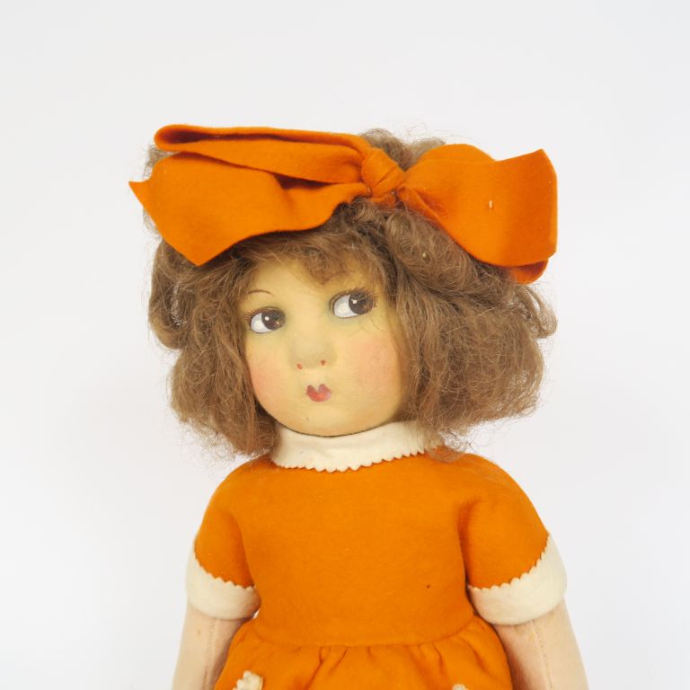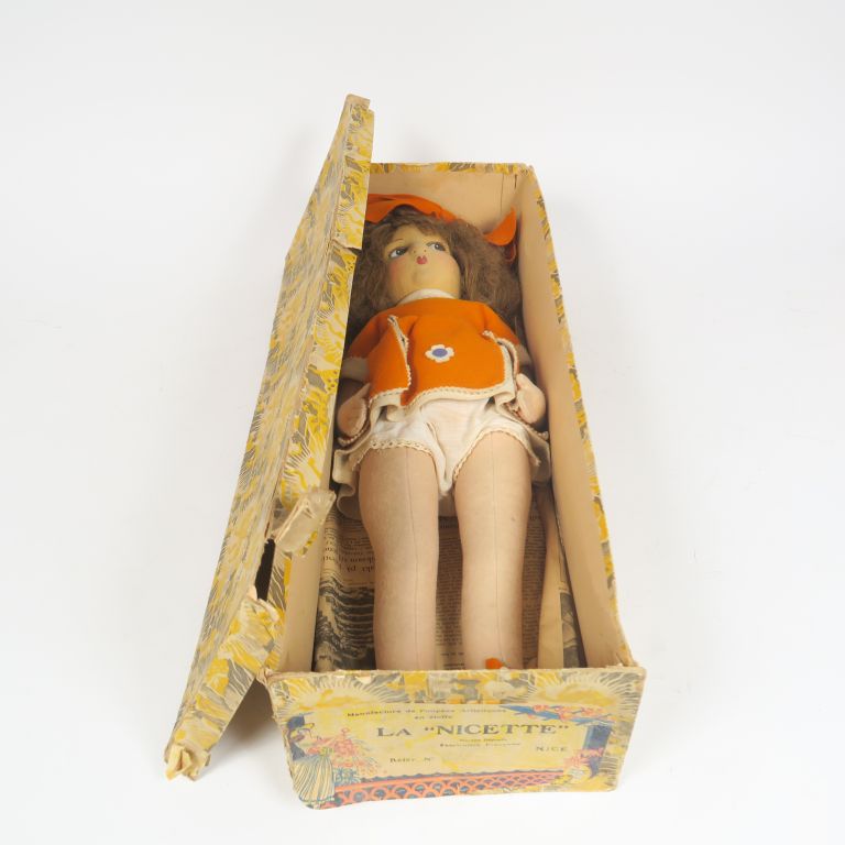 Dans une boite ‘’La NICETTE’’ manufacture de poupées artistiques en étoffe une grande poupée en feutrine en bel état 56cm.