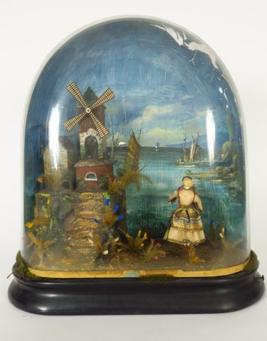 Diorama XIXe à décor de danseurs dans un paysage hollandais, têtes en porcelaine. H. : 41 cm
