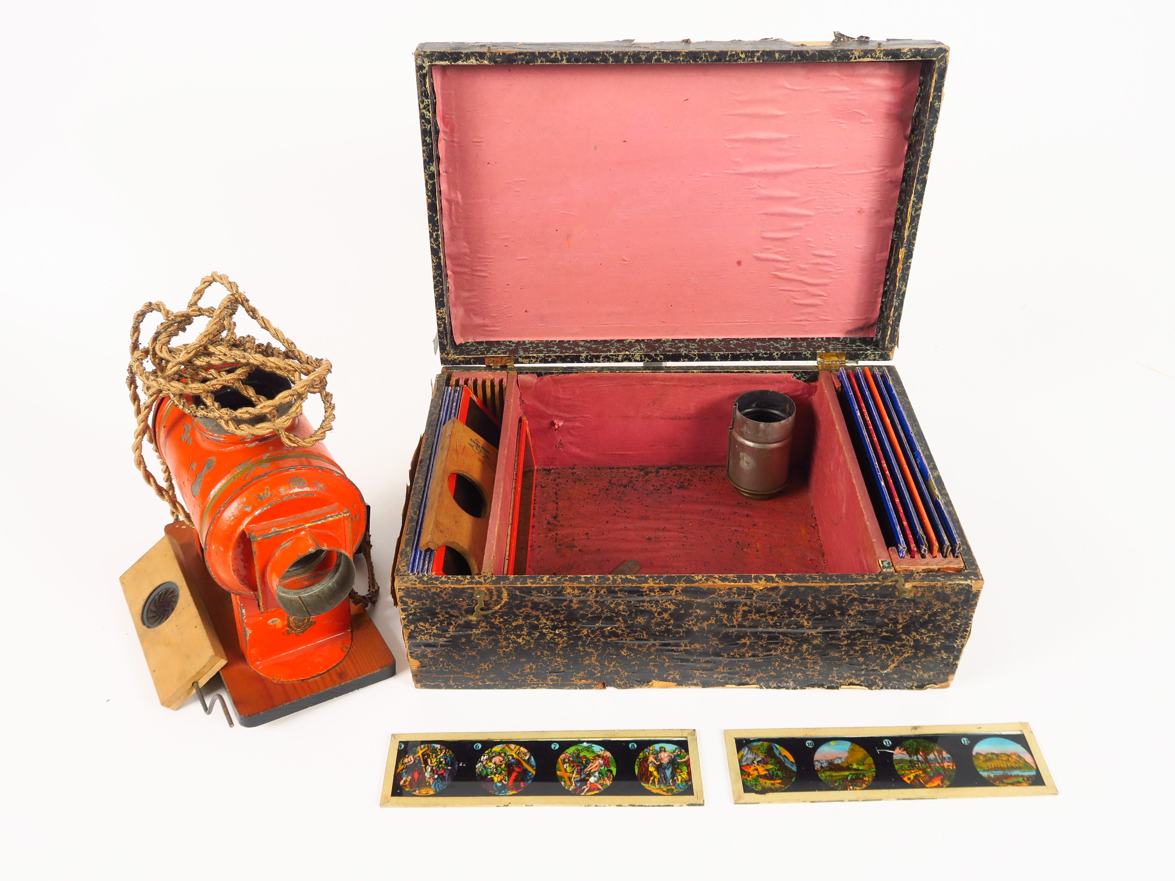 GBN. Lanterne magique avec plaque en coffret d'origine, fatiguée, caléidoscope et autres plaques. 12 pièces, état d'usage