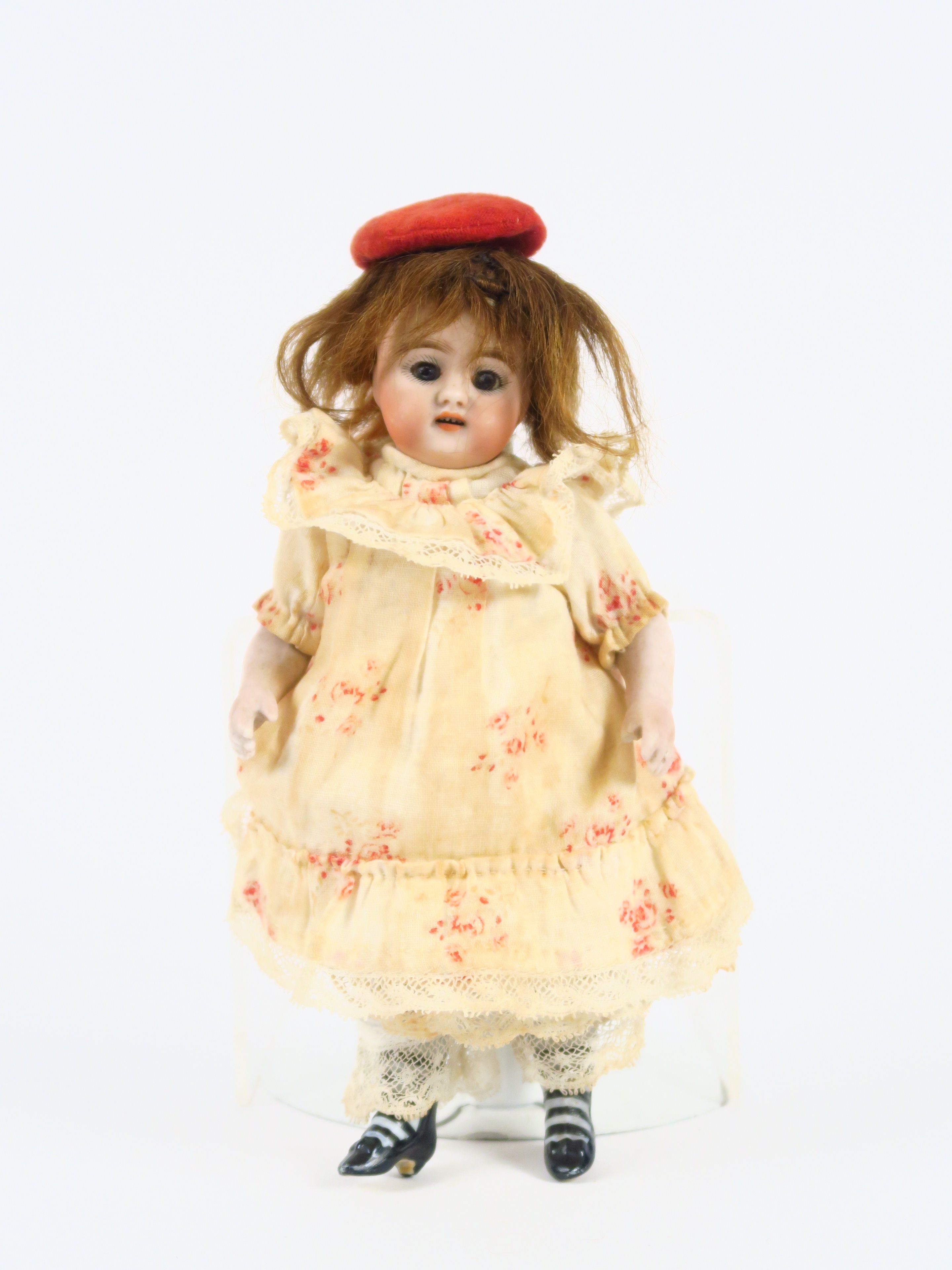 Jolie mignonette Simon Halbig 886 entièrement en porcelaine avec bas bleus et chaussures noires à brides, yeux basculants bruns (un pouce cassé). Taille 19 cm