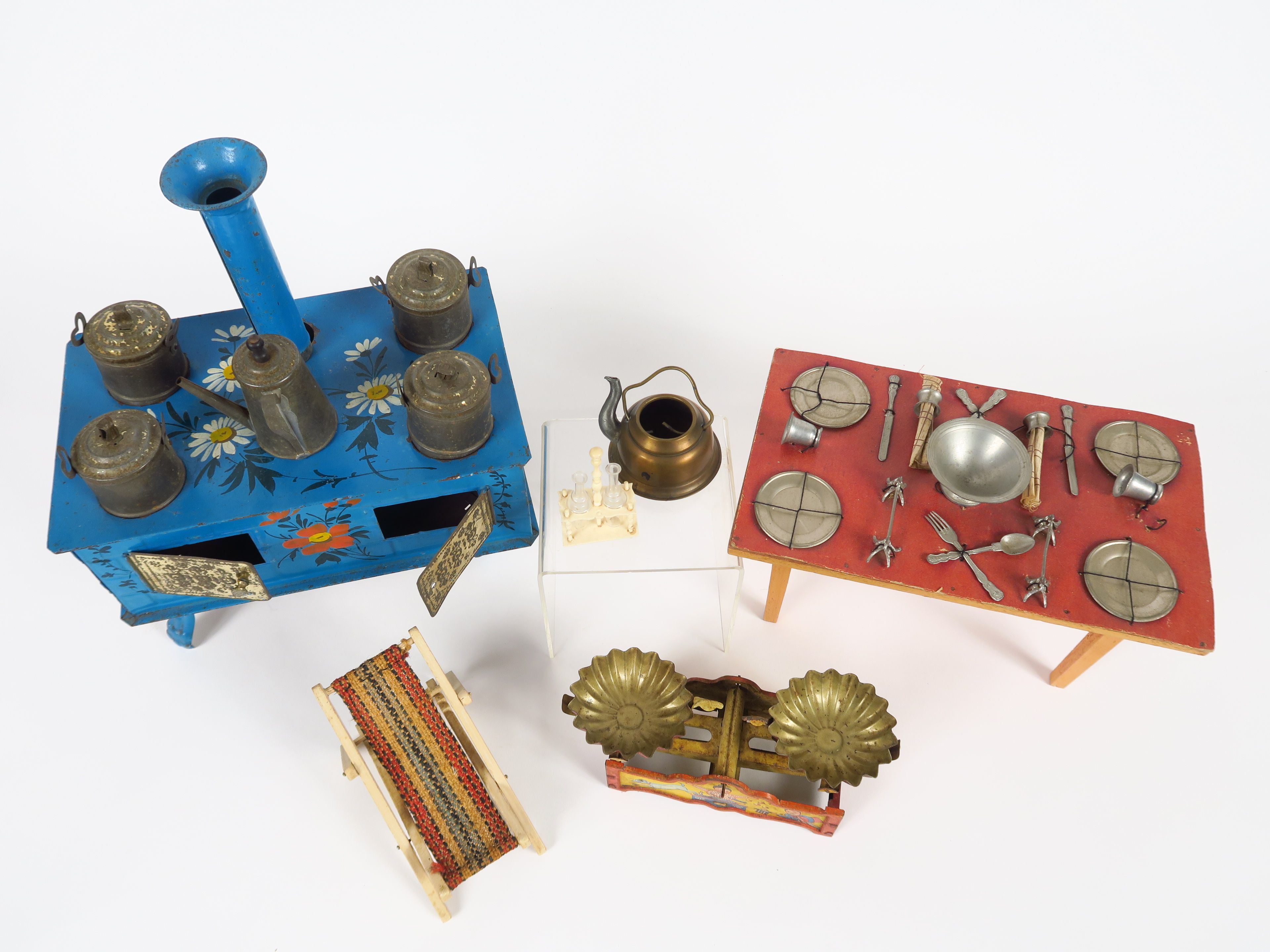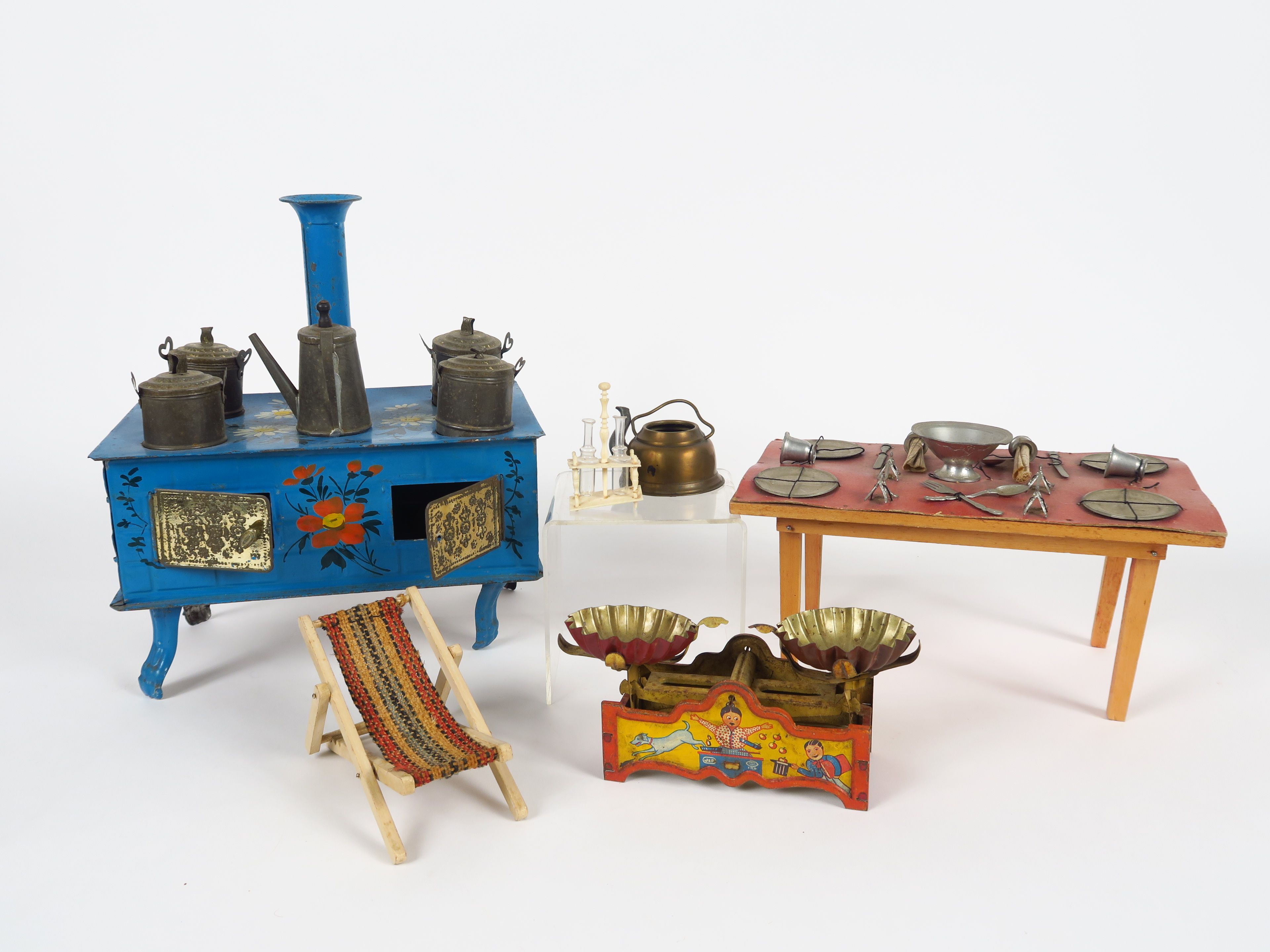 Jolie table de présentation de dinette on y joint un huilier/vinaigrier, une cuisinière en tole (20 x 15 cm) en bel état ainsi qu'une chaise longue de 15 cm et une balance