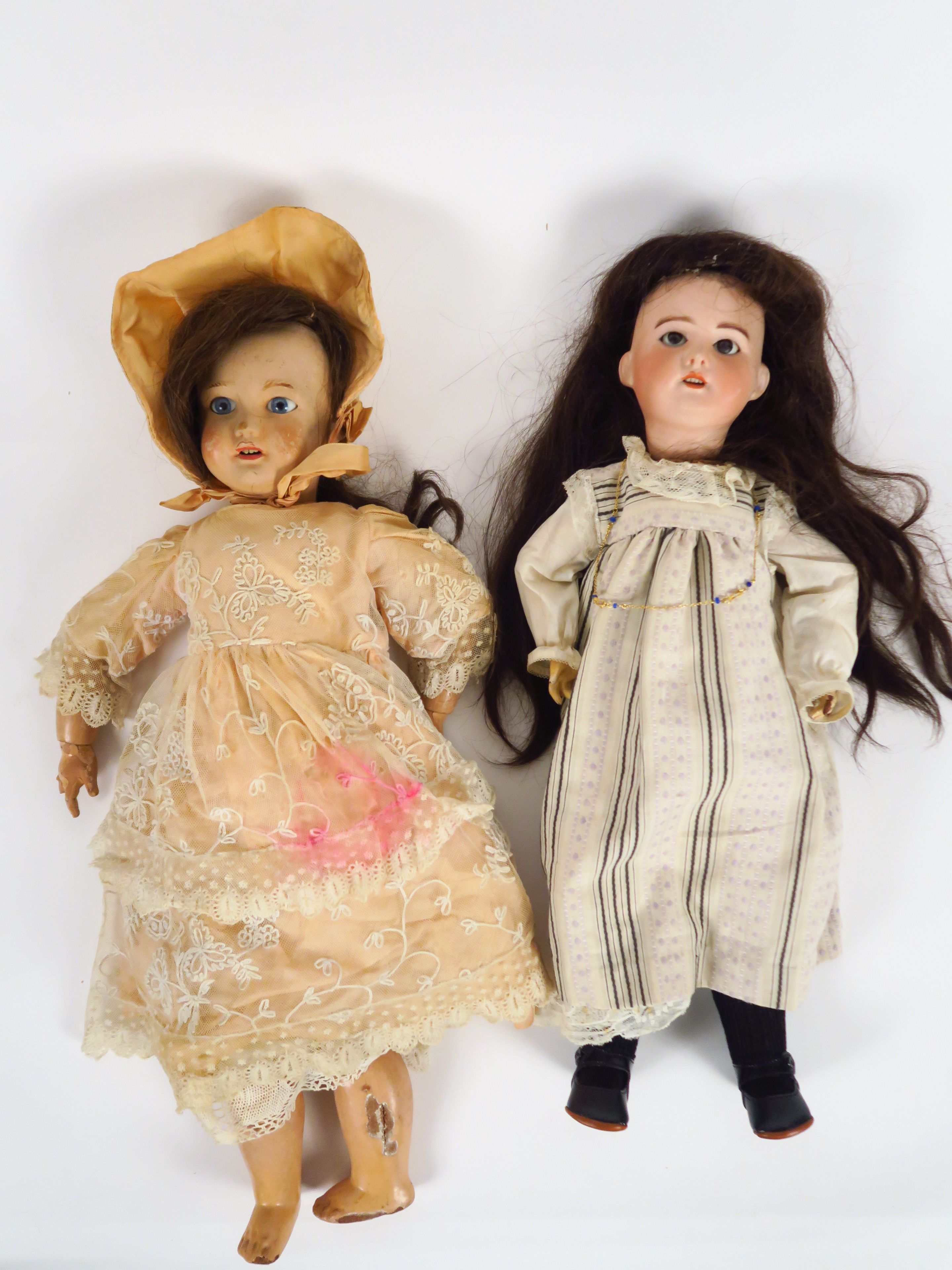 Lot comprenant deux poupées pour pièces dont une entièrement en composition articulée avec jolis vêtements malheureusement tachés et une poupée SFBJ 60 tête en porcelaine, corps en composition 5 pièces avec jolis vêtements de style. Taille 52 cm