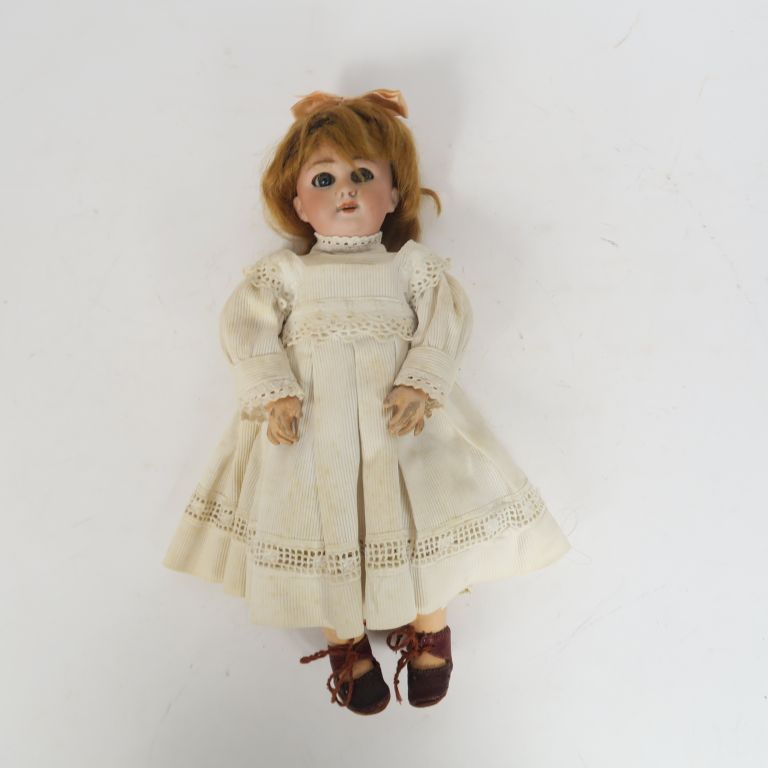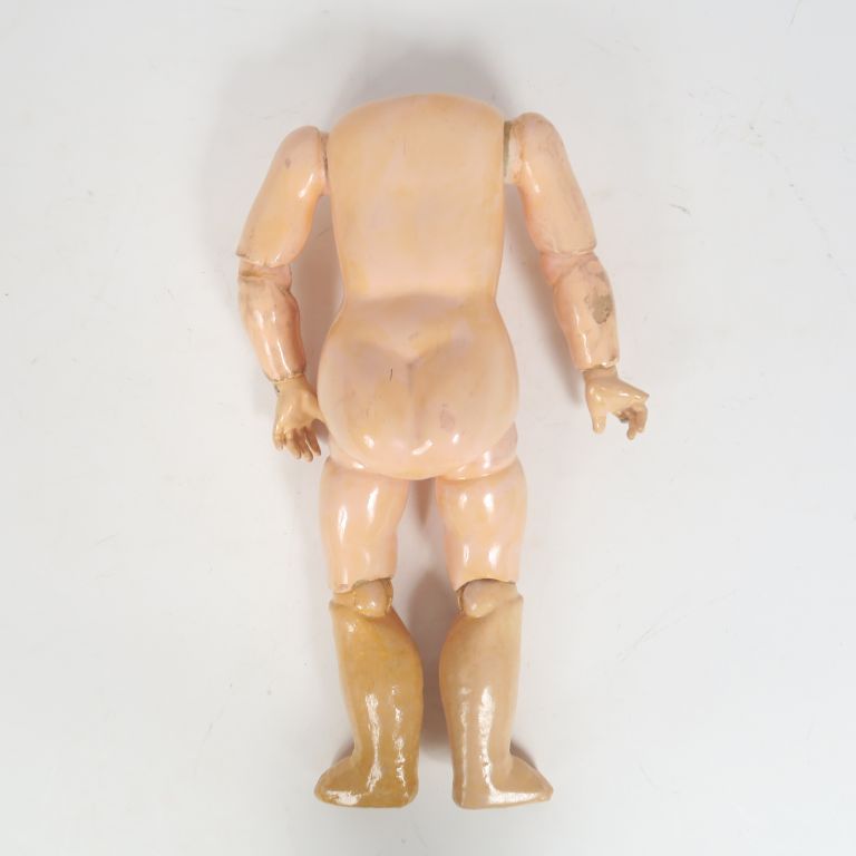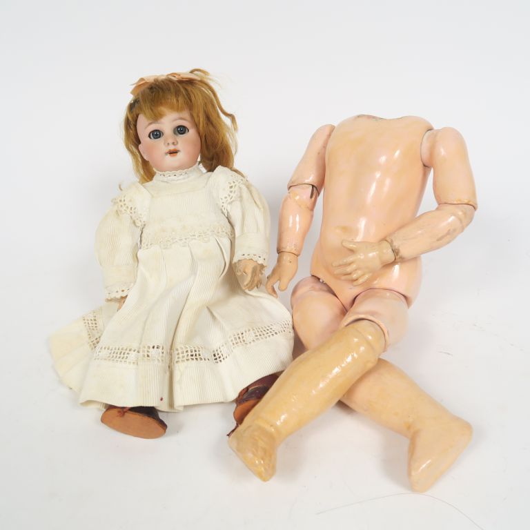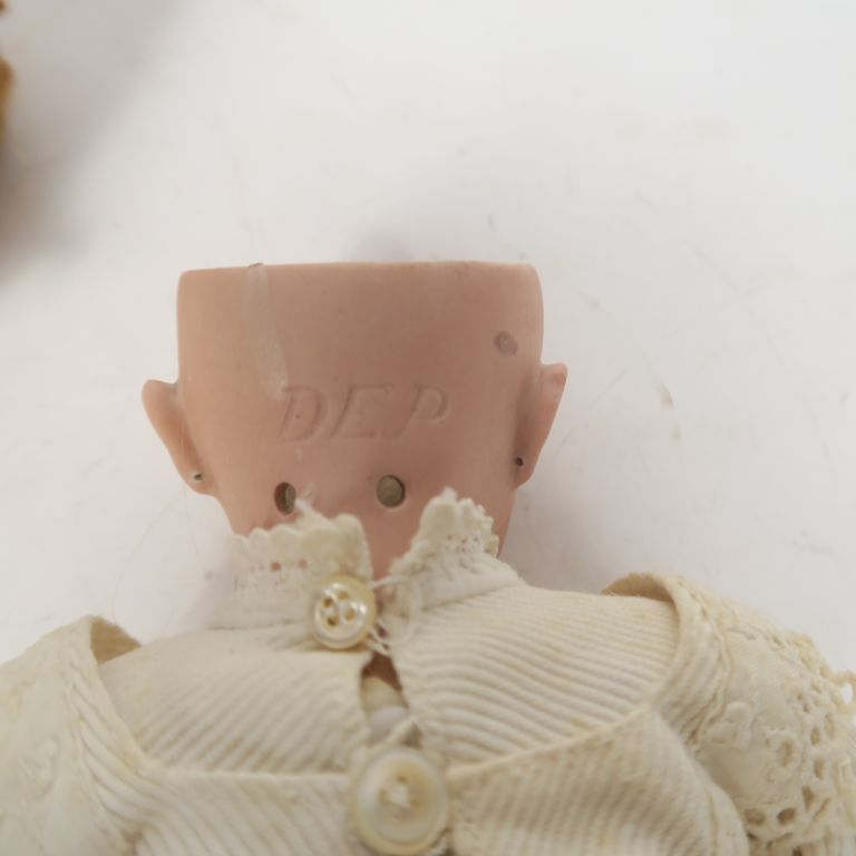 Lot comprenant petite poupée de marque Dep bouche ouverte yeux basculants fixés corps composition articulée, joli vêtements anciens et chaussures taille 28 cm on y joint un corps composition articulée de fabrication allemande avec les bas de jambes non d'origine taille 31 cm