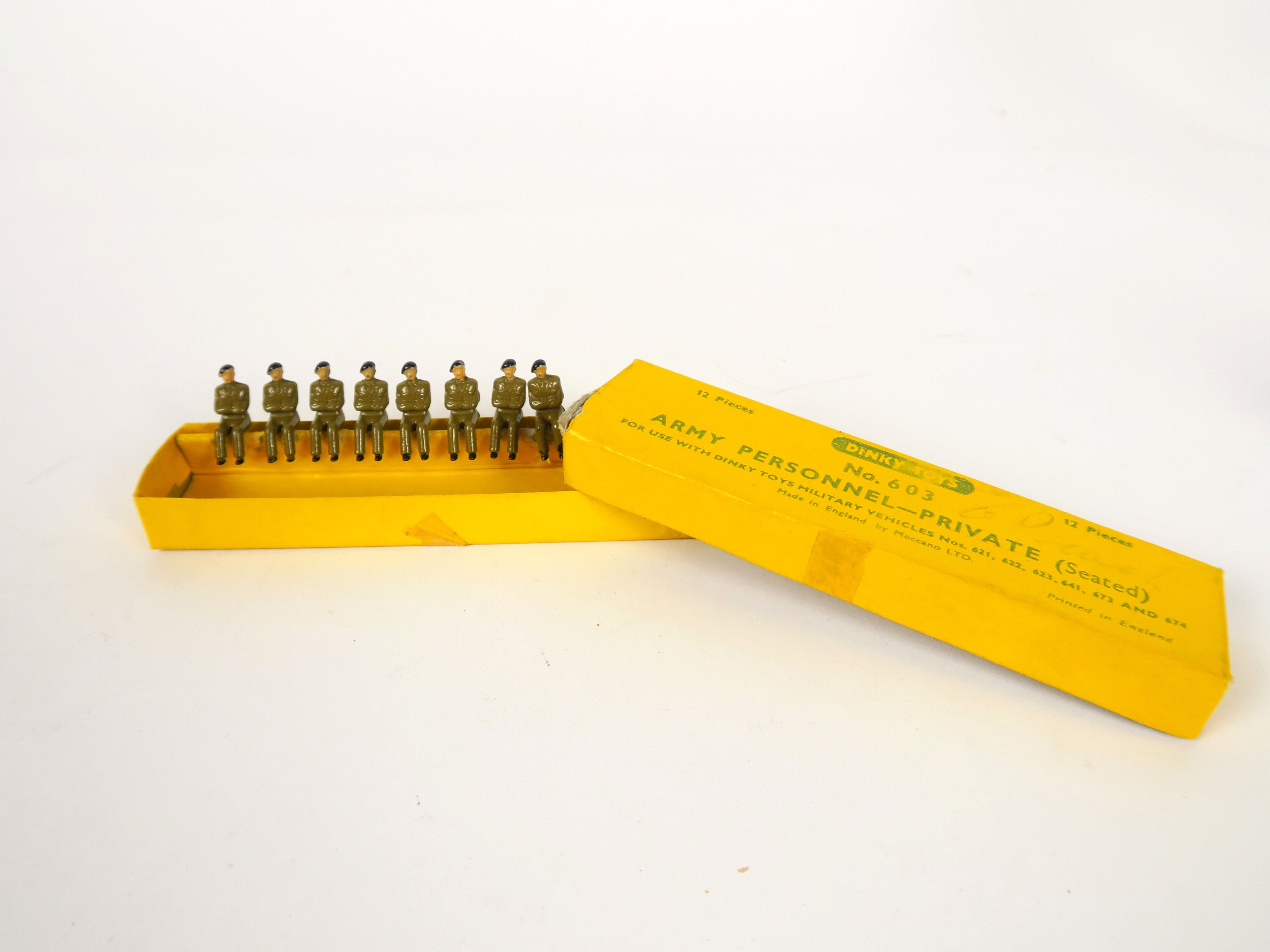 Lot de 2 miniatures Dinky Toys : - Panhard EBR Amoured car ref. 80A, très bel état, boite d'origine - camion d'armée 1 T, ref. 641, très bel état, boite d'origine on y joint une boite n° 60,3 Army personnel Private. 8 pièces, bel état