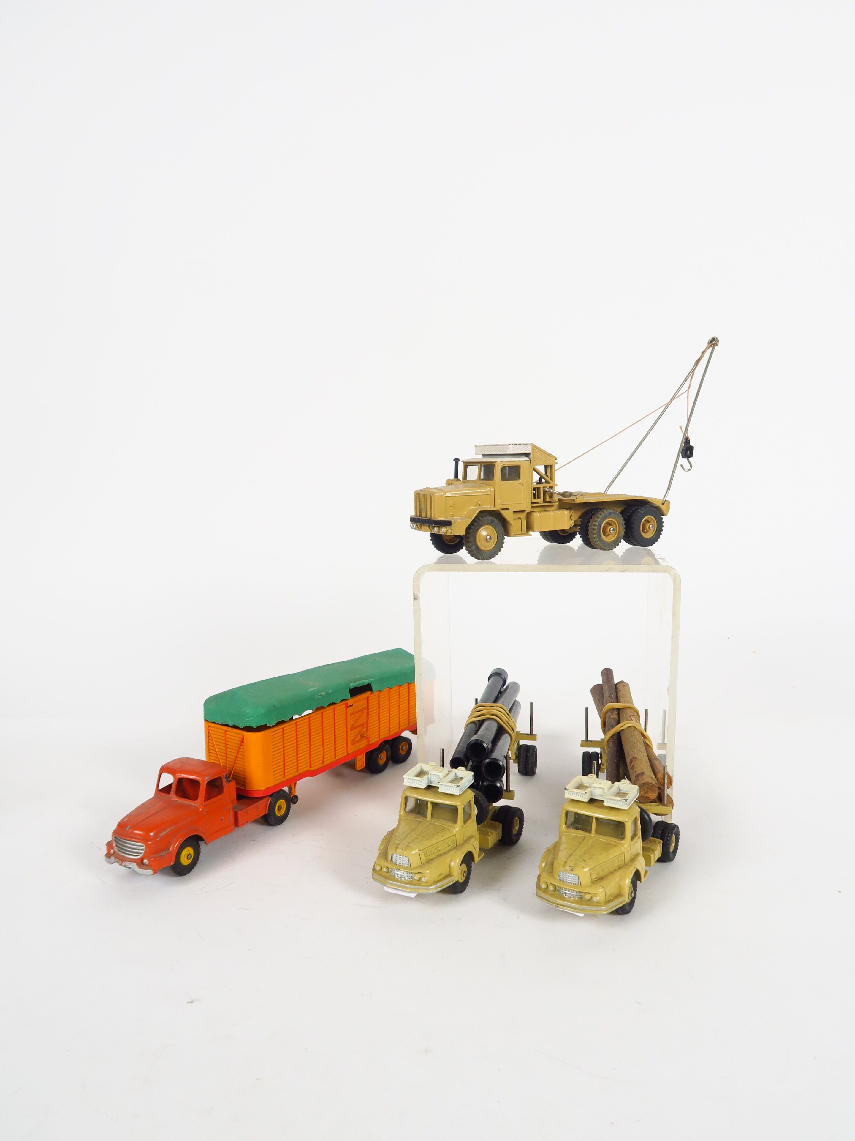 Lot de 4 miniatures Dinky Toys 1/43e Supertoys en état d'usage : - Tracteur Willeme ref. 36 avec semi remorque bachée - Berliet GBO - 2 tracteurs Unic ref. 39 transport de tube