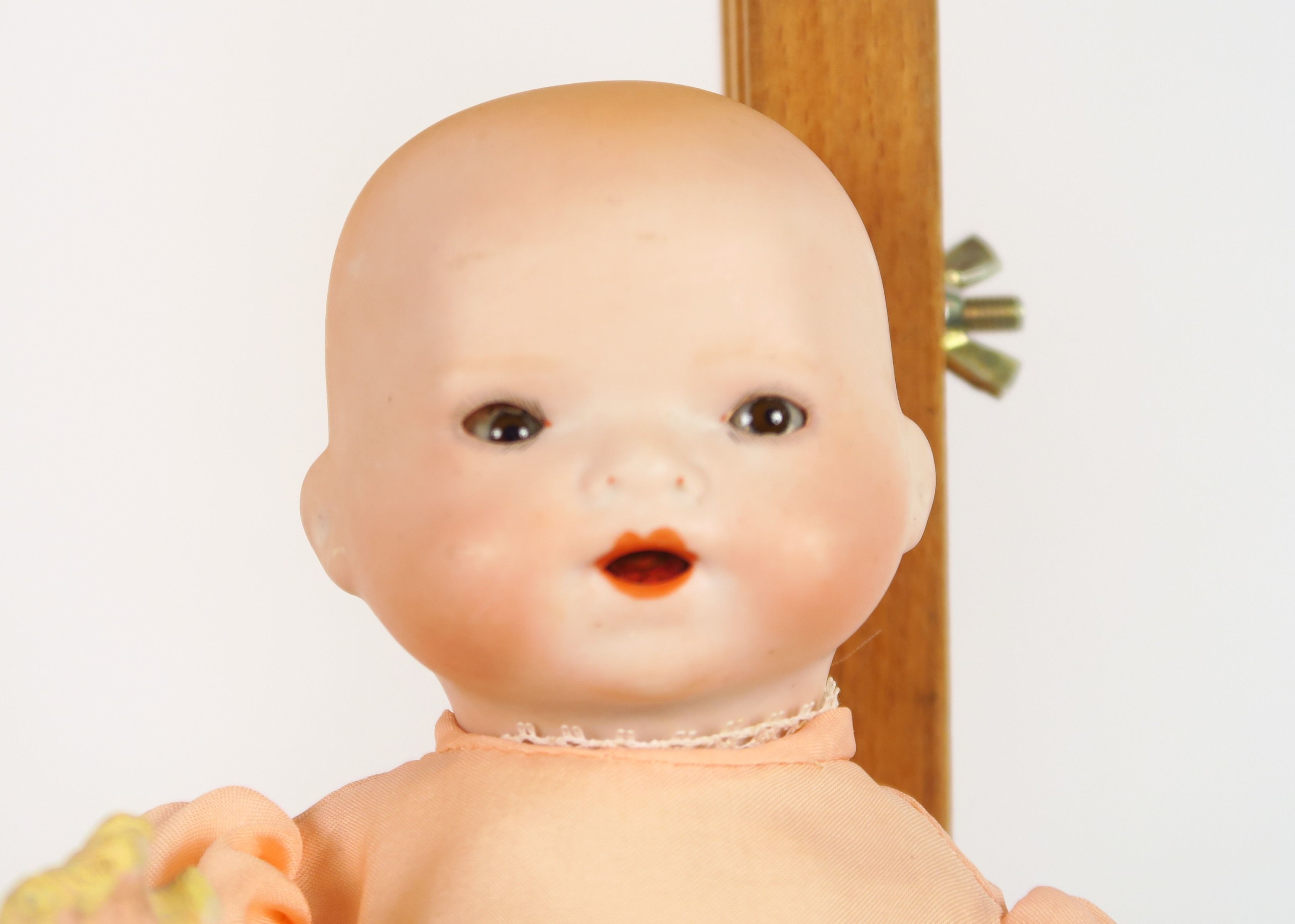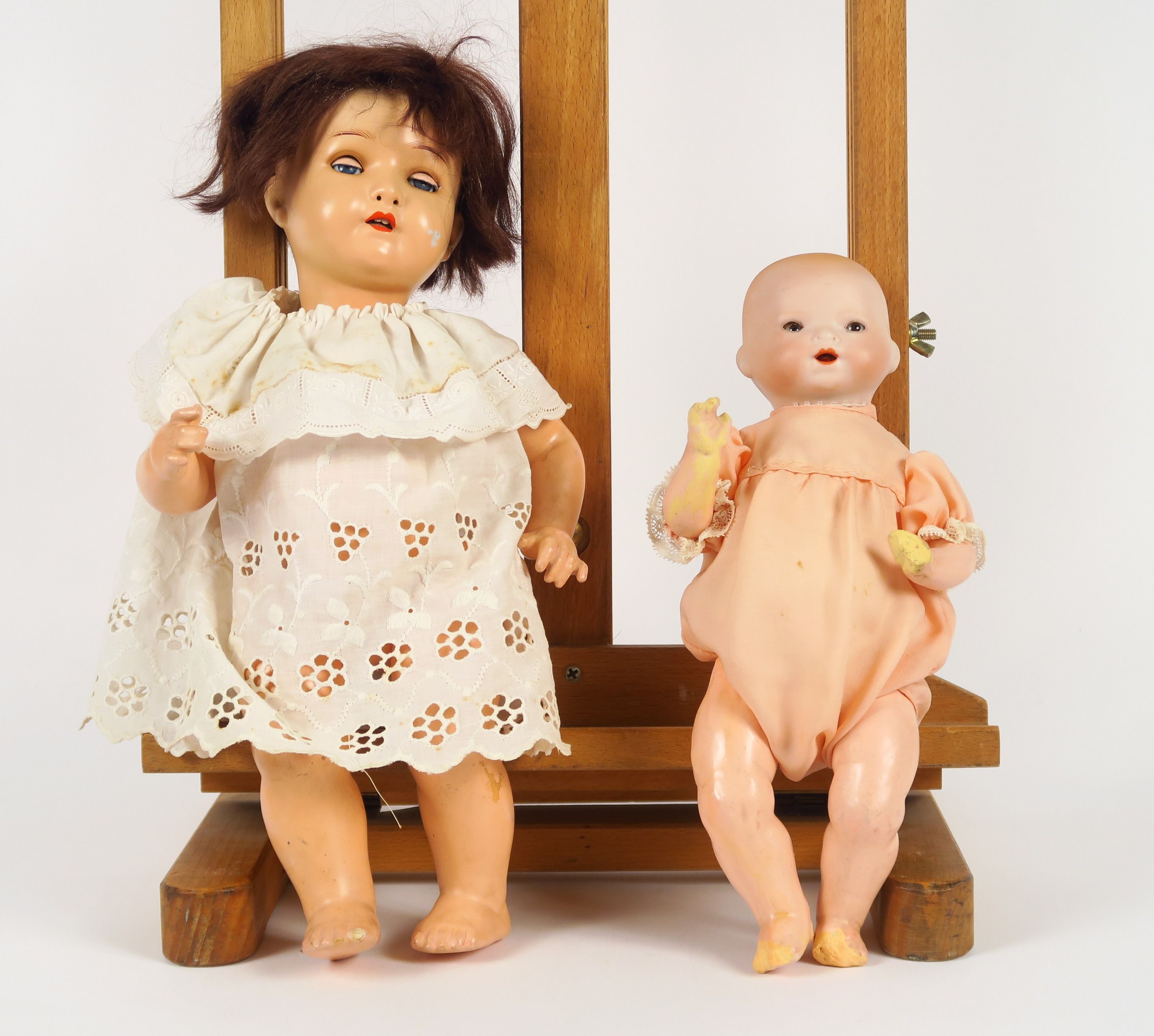 Lot de deux bébés de caractère en état d'usage H B, tête porcelaine pleine bon état, corps en composition (à restaurer), un bébé en porcelaine peinte non cuite Heubach