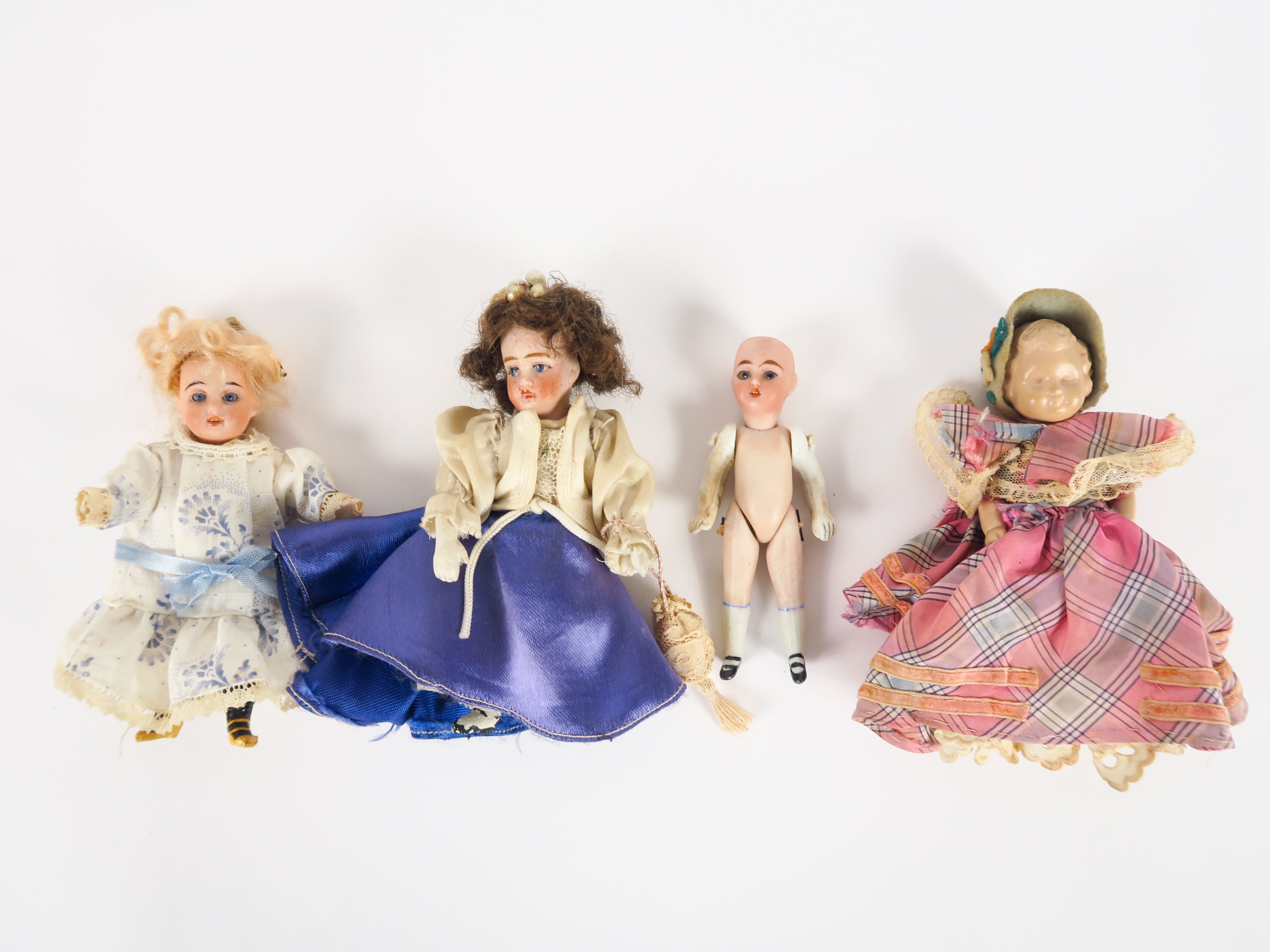 Lot de deux mignonettes : une pour la pièce et l'autre jolie tête allemande sur corps en composition. Taille 12 cm , on y joint une mignonette en porcelaine décolorée et une poupée en caoutchouc