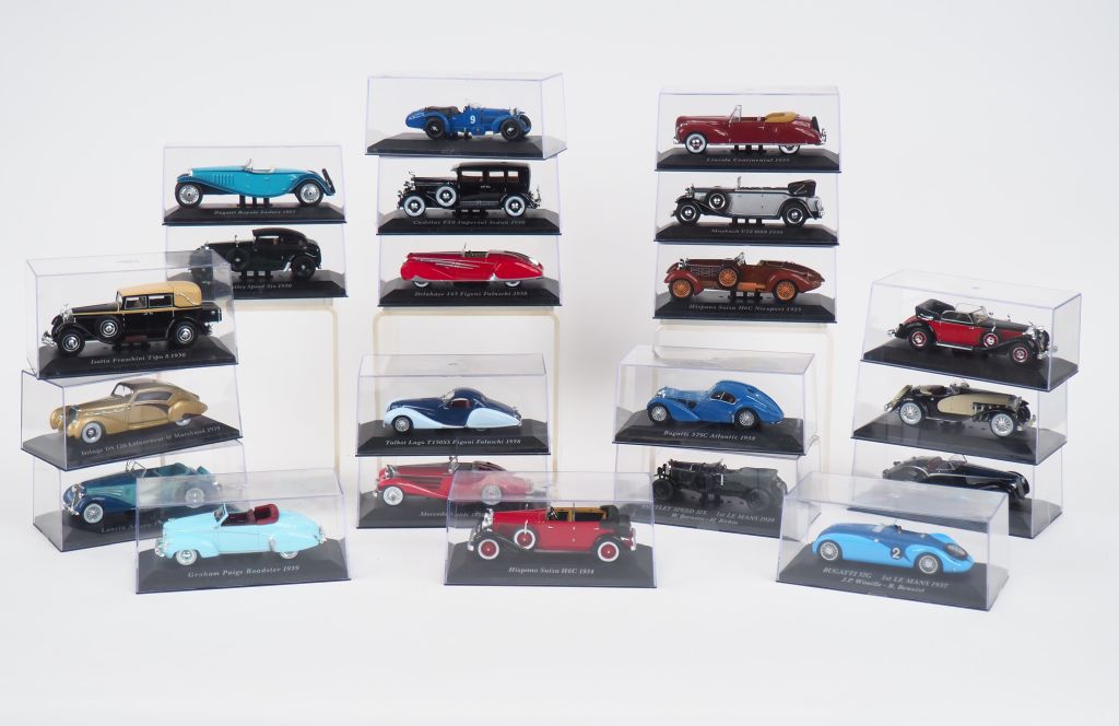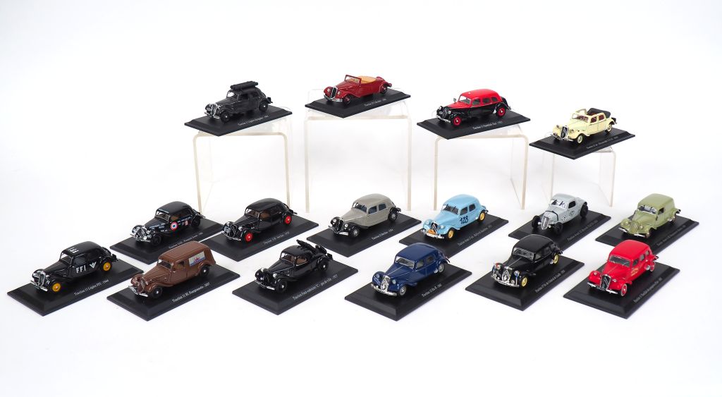 Lot de miniatures récentes au 1/43ème, de diverses marques : certaines de séries Presse en boite cristal, d'autres sur socle : 21 boites cristal et 16 dont série Traction sur socle.
