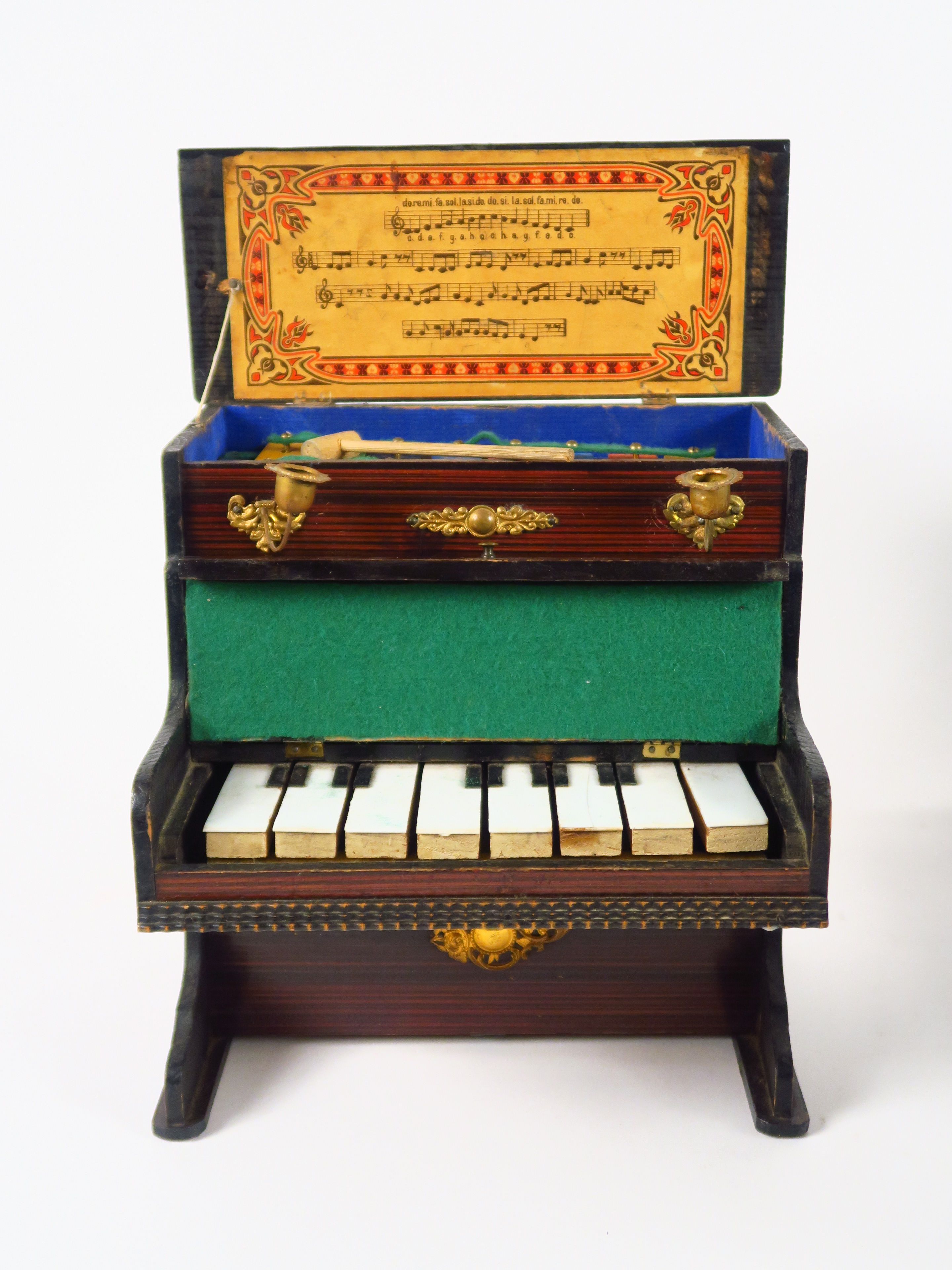 Lot de mobilier de poupée XIXème comprenant un lit fin XIXème 51 cm et petit piano (restaurations). 24 x 27 cm