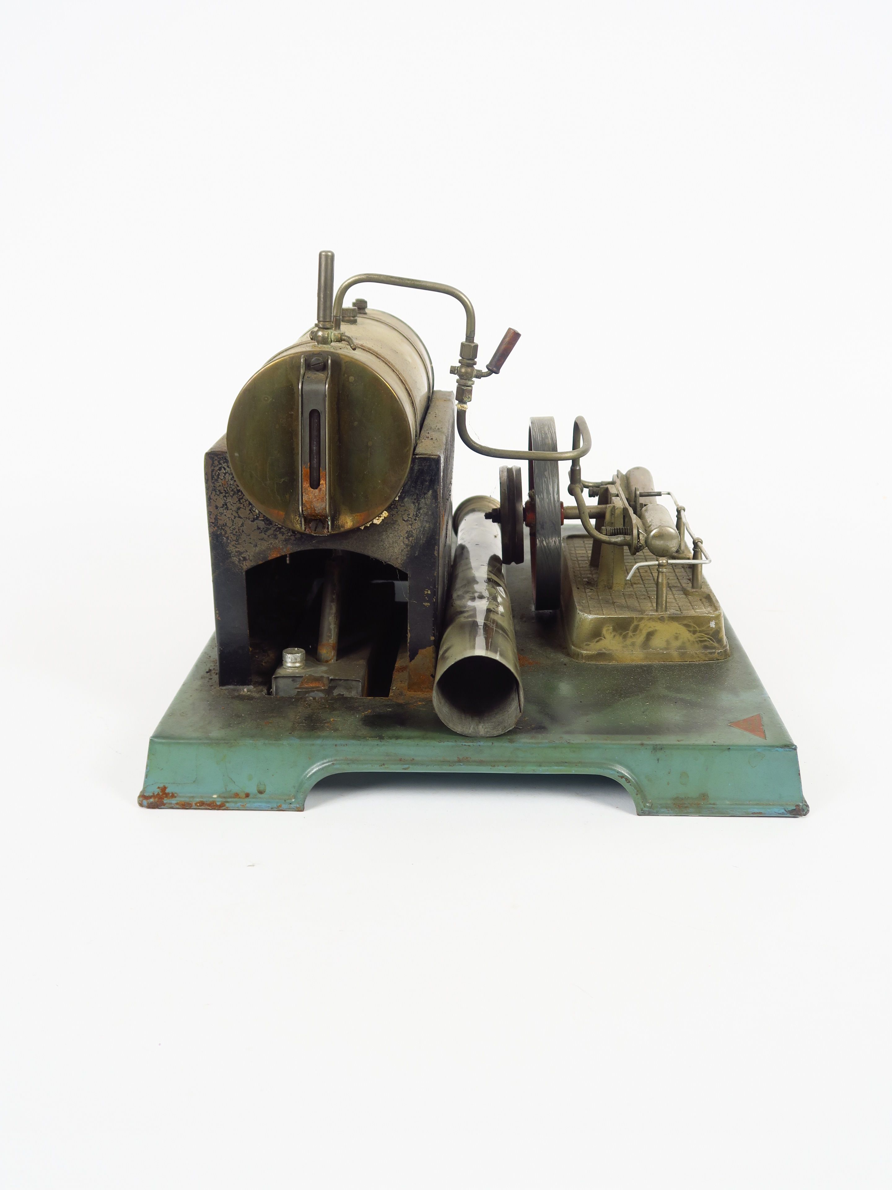Machine à vapeur horizontal incomplet sur plaque marqué 'JC France'. Dim. 35 x 26 cm. H. 40 cm (cheminée)