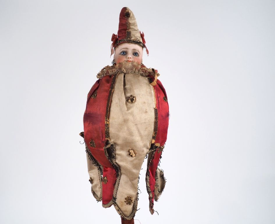 Marotte musicale à tête porcelaine de marque Gaultier, costume d'origine en état d'usage , fonctionnante. 33 cm Expert : Murielle AUFFRET