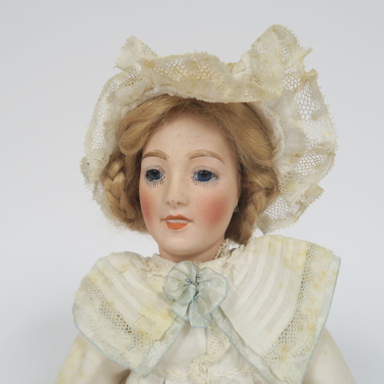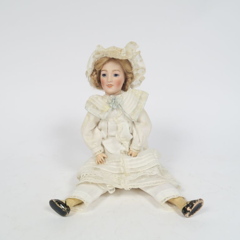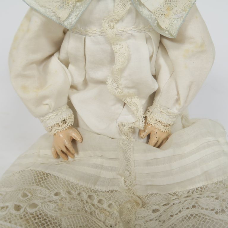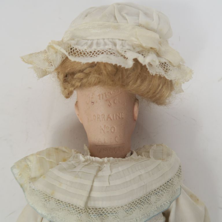 Masson poupée à tête porcelaine marquée Lorraine 0 les yeux sont en verre bleu foncé la bouche est ouverte fermée le corps en composition 5 pièces avec chaussures peintes en état d’usage avec trace de repeint taille de la poupée 37cm.
