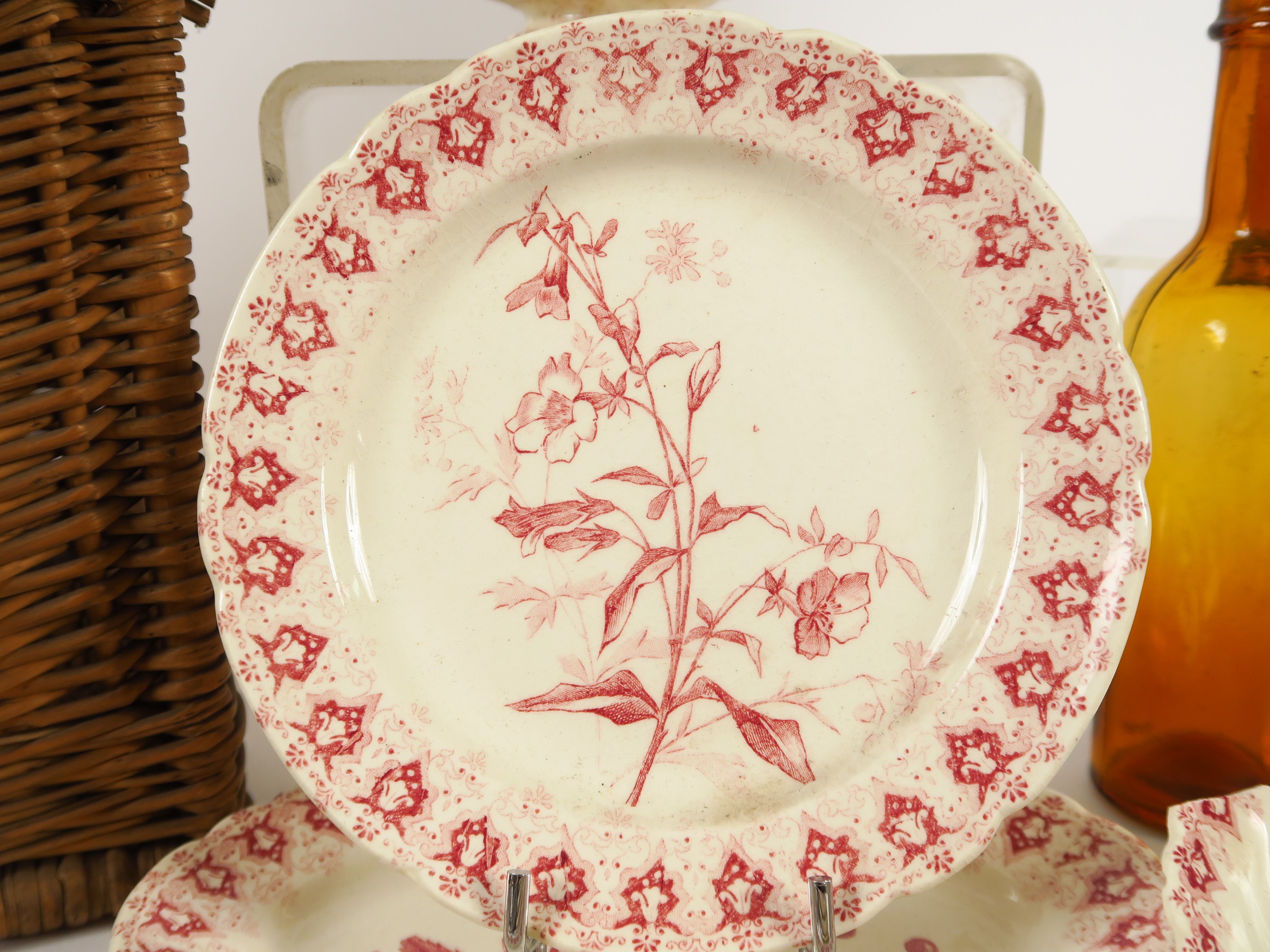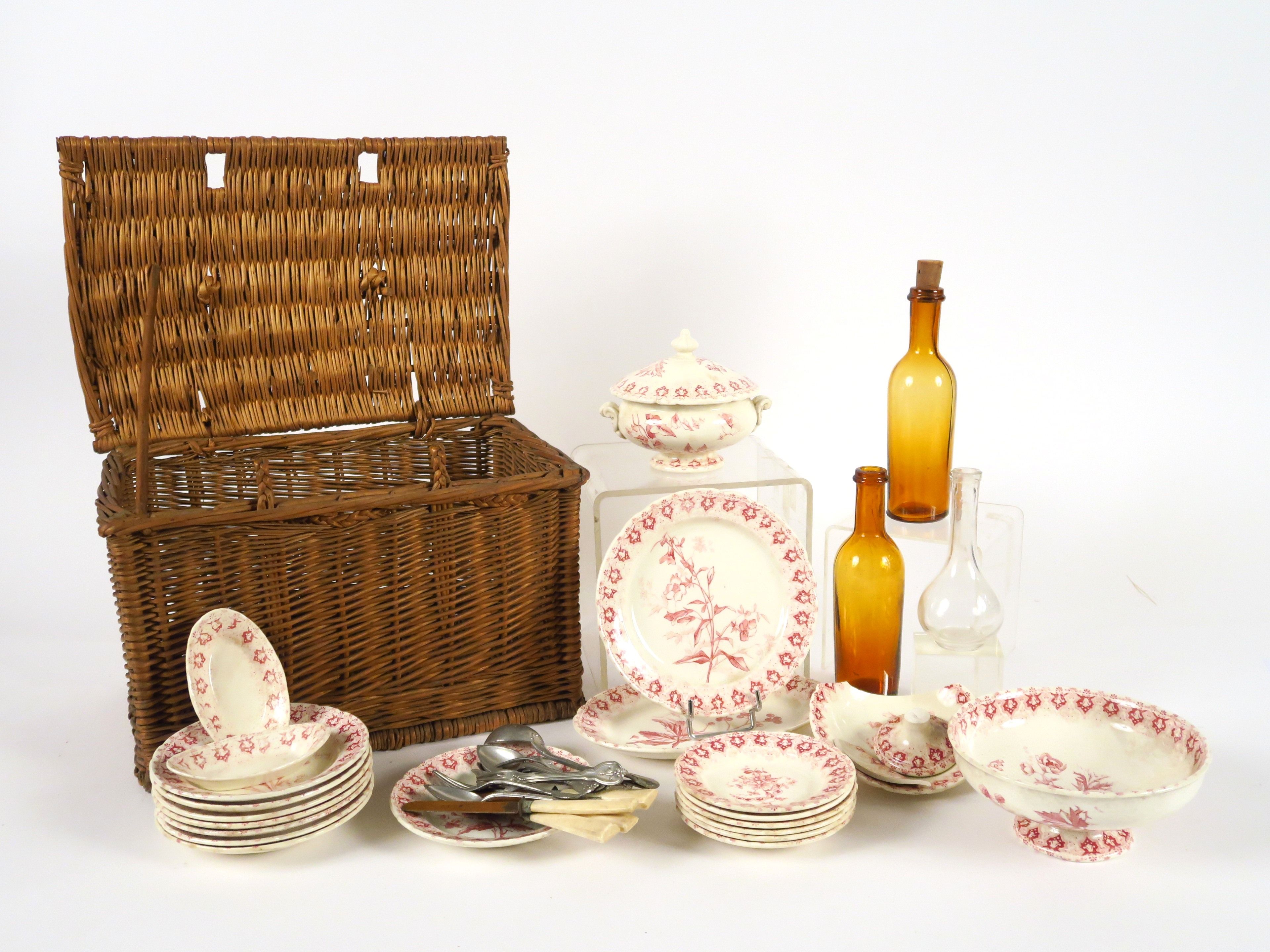 Partie de dinette en faïence de Choisy en camaïeu rouge avec couverts et carafes (incomplète et accidents)