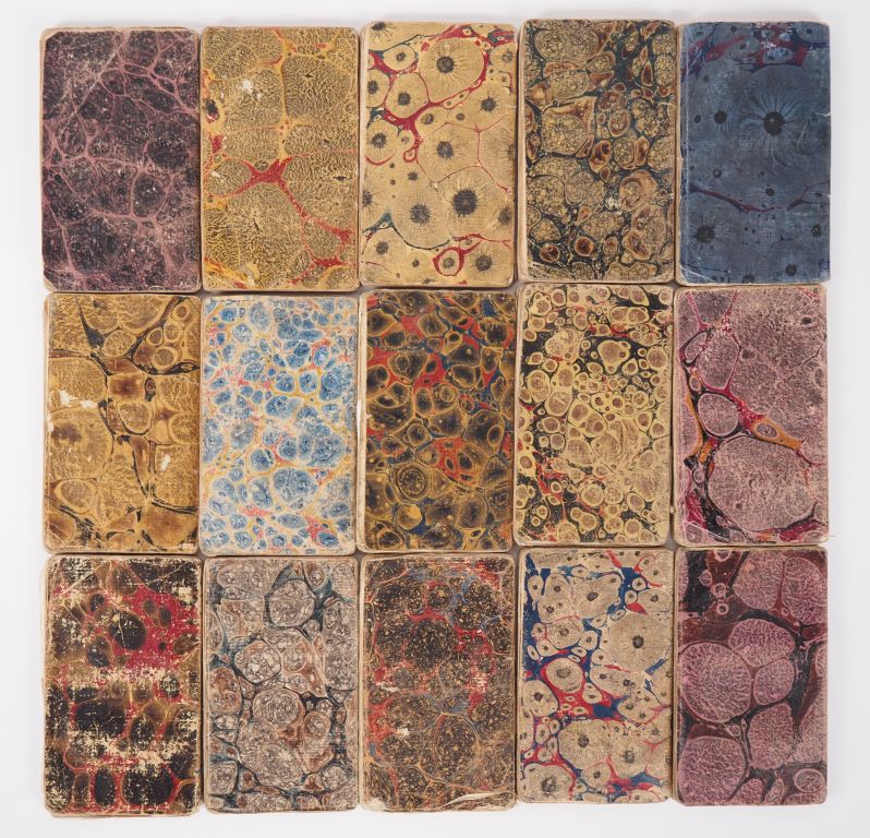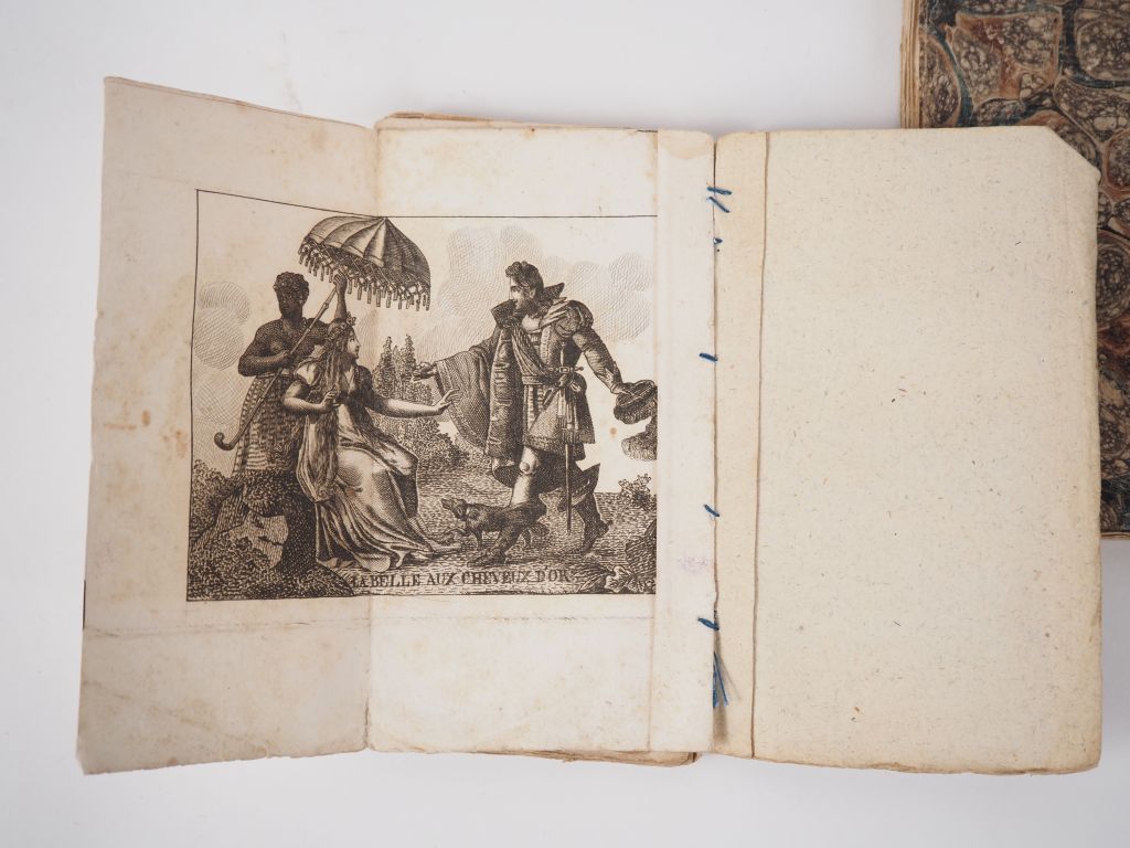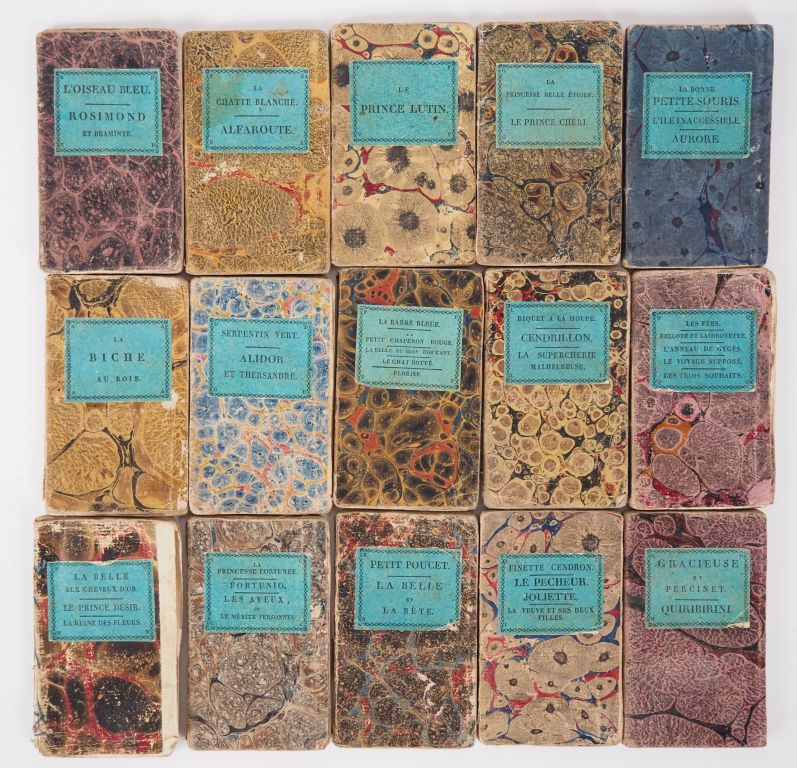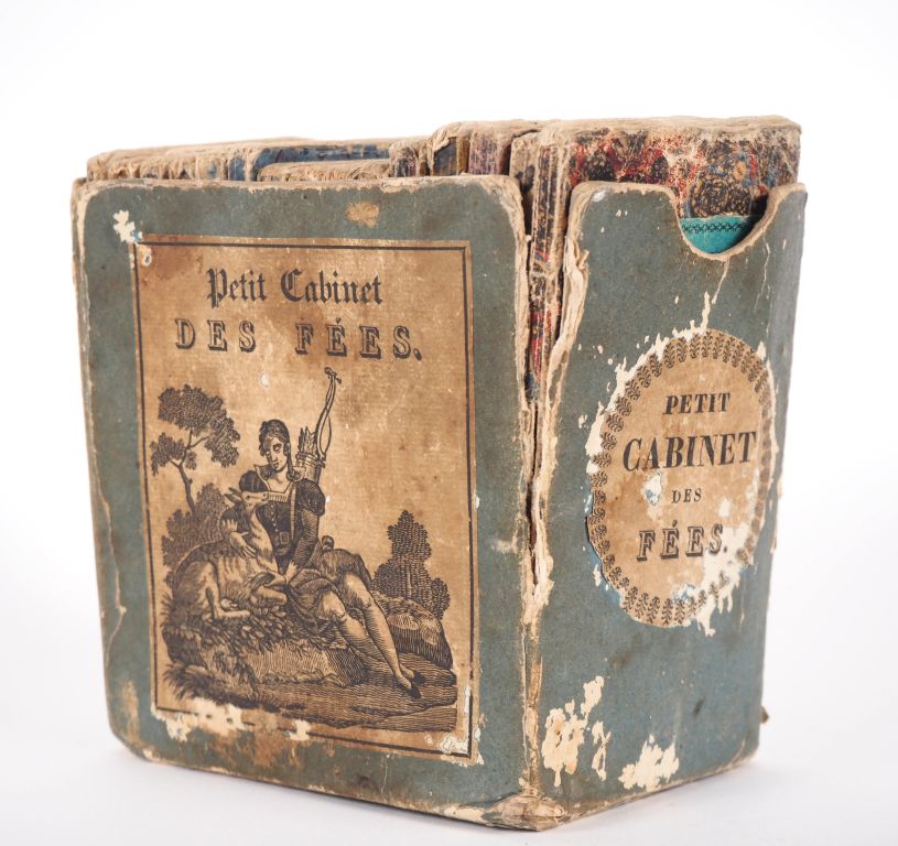 Petit cabinet des fées Paris chez Delarue librairie quai dens Augustins Lille chez castiaux librairie Lille imprimerie de Bloquel 1810 15 volumes de 11 cm recouvert de papier marbré avec le titre sur un papier bleu conditions usagées avec quelques traces d’humidités et taches des pages mais chaque volume contient sa gravure une gravure a été recousue a l’envers, le tout dans un emballage cartonné d’époque avec gravures, en mauvais état… Expert : Murielle Auffret