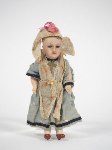 Petite mignonette française, tête en porcelaine SFBG, costume folklorique état d'usage. H. 16 cm