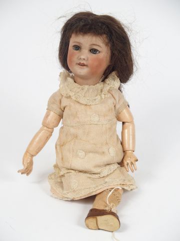 Petite poupée SFBJ taille 3, yeux fixes bleus, perruque d'origine, tête très sale, joli corps composition articulé, manque un bas de jambe, vêtements anciens