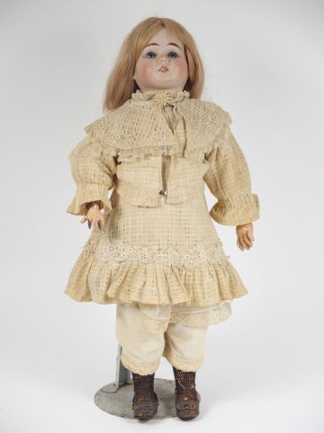 Poupée allemande pour le marché français, tête en porcelaine marquée Fleishmann, yeux fixes bleu, bouche ouverte, perruque de style, vêtements en partie anciens. Corps semi-articulé. H. 54 cm