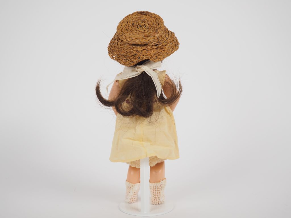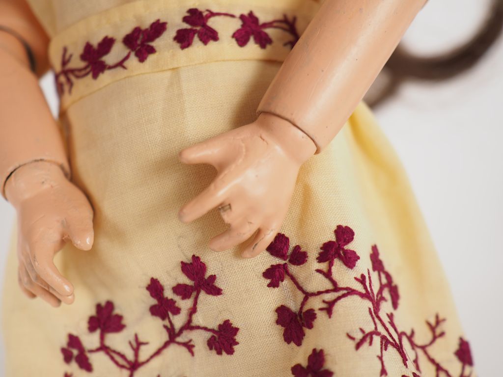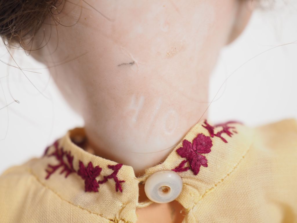 Poupée ancienne Fleischmann type Bleuette tête porcelaine bouche ouverte avec 4 dents yeux fixes bleus, perruque de style, la tête est marquée 4/0 corps composition articulé. Marquée 2 entre les épaules et sous les pieds. Circa 1910. Taille 28,5 cm. Bon état général trace de repeints sur le corps. Manque un doigt. Très jolis vêtements de style brodé.