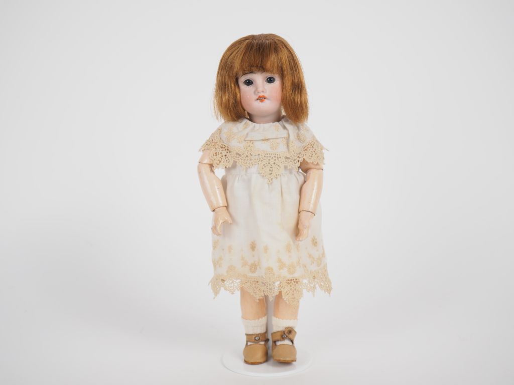 Poupée Bleuette Fleischmann, tête porcelaine bouche ouverte yeux fixes Bleus perruque cheveux naturels, marqué 6/0, corps composition articulé marqué 2 entre les épaules. Circa 1910. Taille 27 cm. A signaler cette poupée a un fêle au front. Vêtements de style, jolies chaussures anciennes.