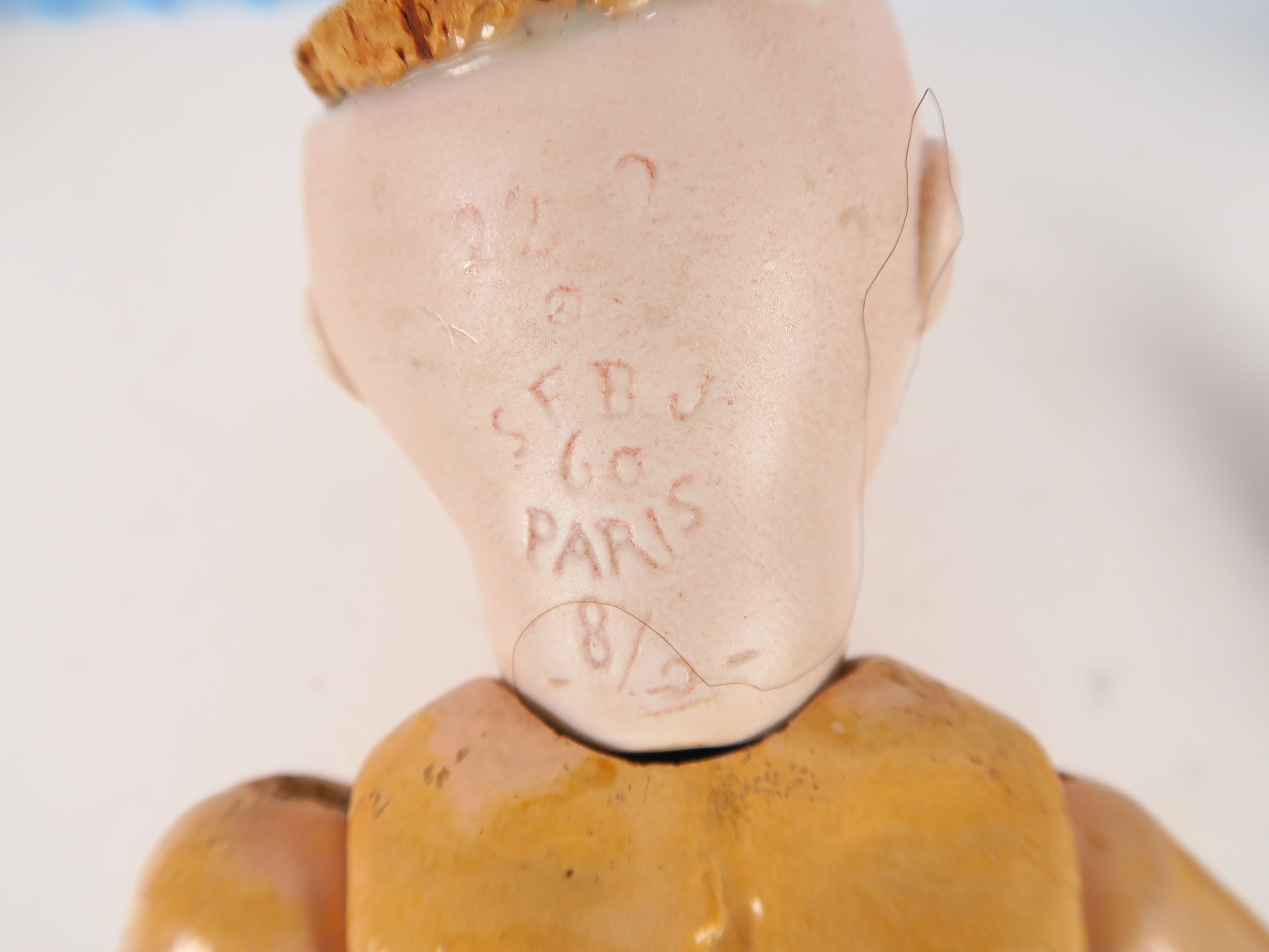 Poupée bleuette marque SFBJ 60 8/0, 1 sous le pied, la poupée a un défaut de moulage au buste qui ne permet pas à la tête de rentrer dans le corps. Perruque ancienne, vêtements de style. Taille 28 cm