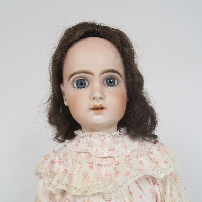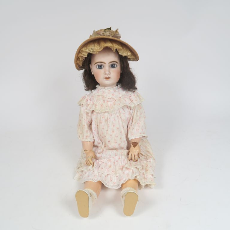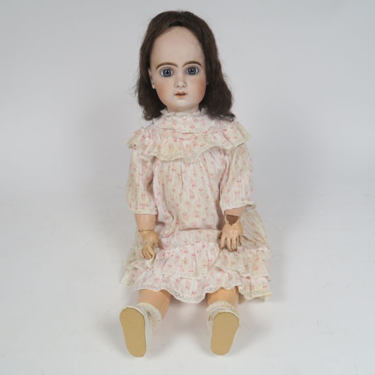 Poupée de fabrication française de marque jumeau période SFBJ léger fel au front yeux fixes bleu bouche ouverte corps composition articulé taille 9 vêtement et perruque anciens 60 cm