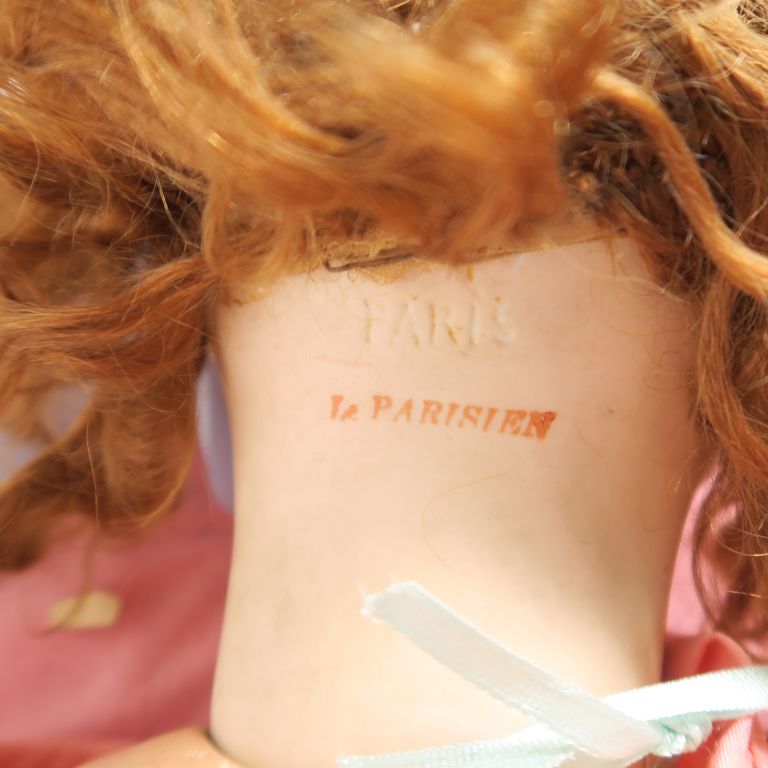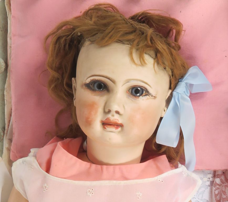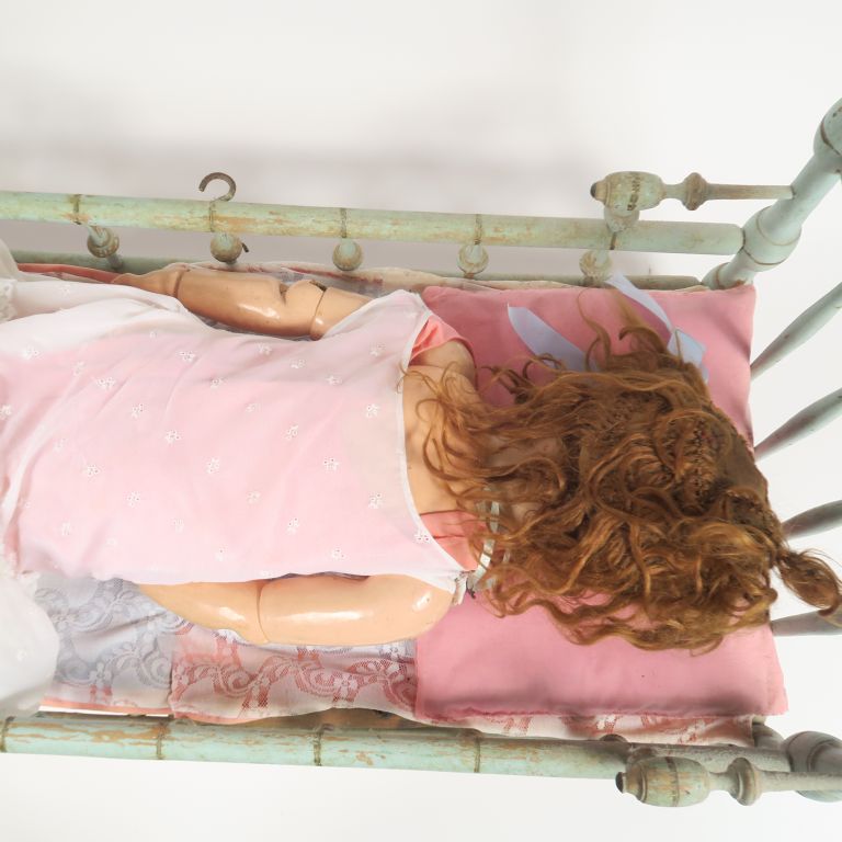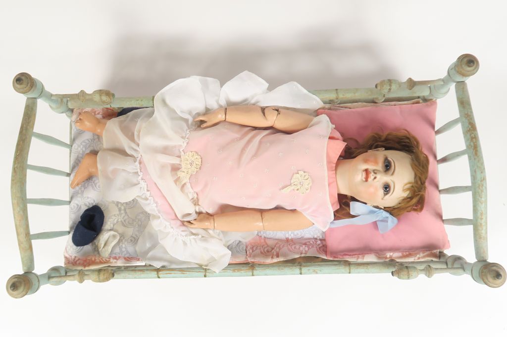 Poupée de fabrication française de marque Steiner, marquée A19 Paris La parisienne, corps en composition articulé. H. 70 cm. Cette poupée a été gravement repeinte sur la porcelaine on y joint un lit de poupée
