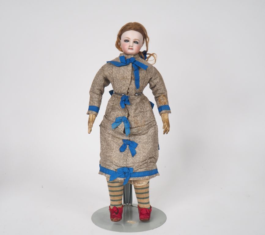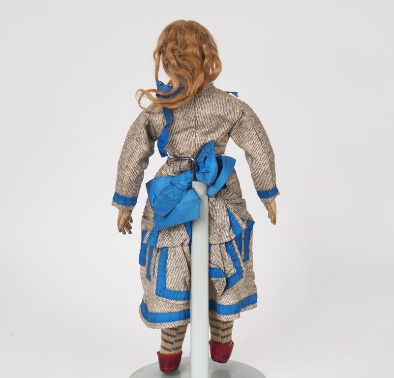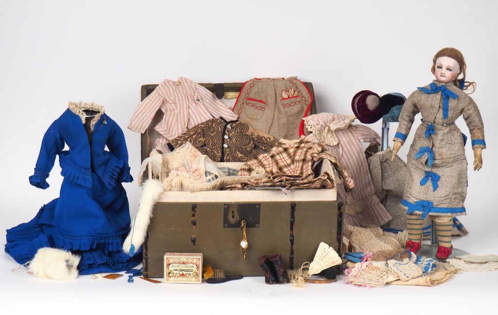 Poupée de fabrication française GAUTIER Circa 1870 avec son trousseau comprenant une malle, chapeaux, chaussures, bijoux et accessoires de toilette, robes, jupes, corsage, sous-vêtements, chale. Poupée tête porcelaine aux yeux fixes bleus, bouche fermée, collerette porcelaine, corps en chevreau blanc. Bel état général. H. 36 cm Expert : Murielle Auffret