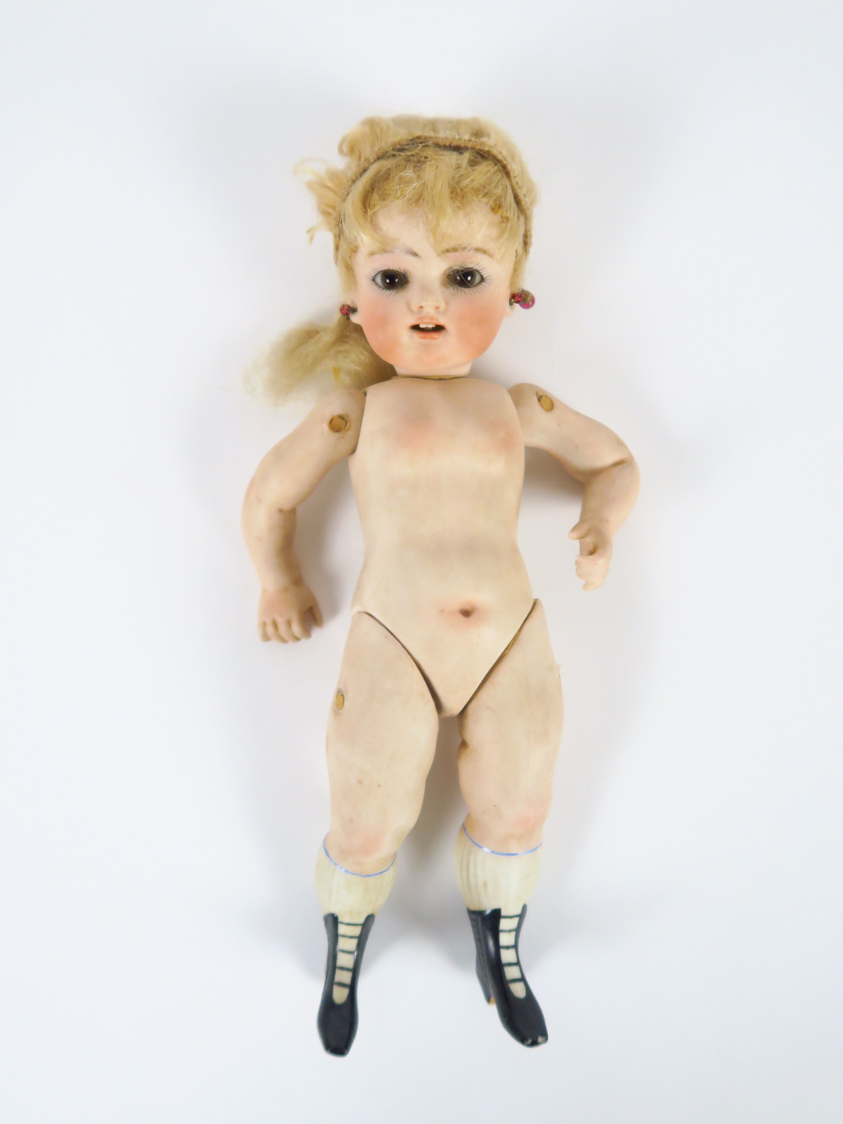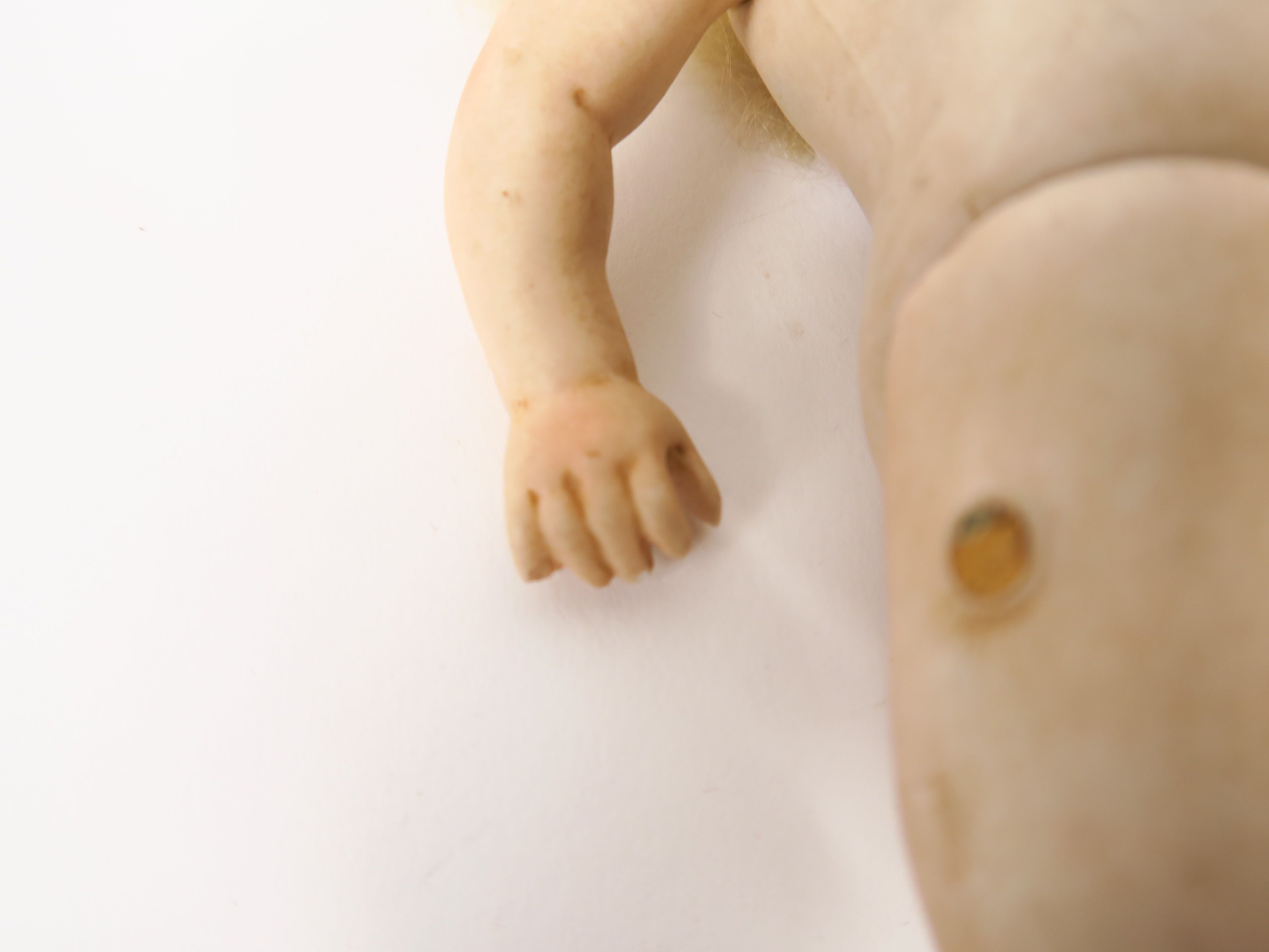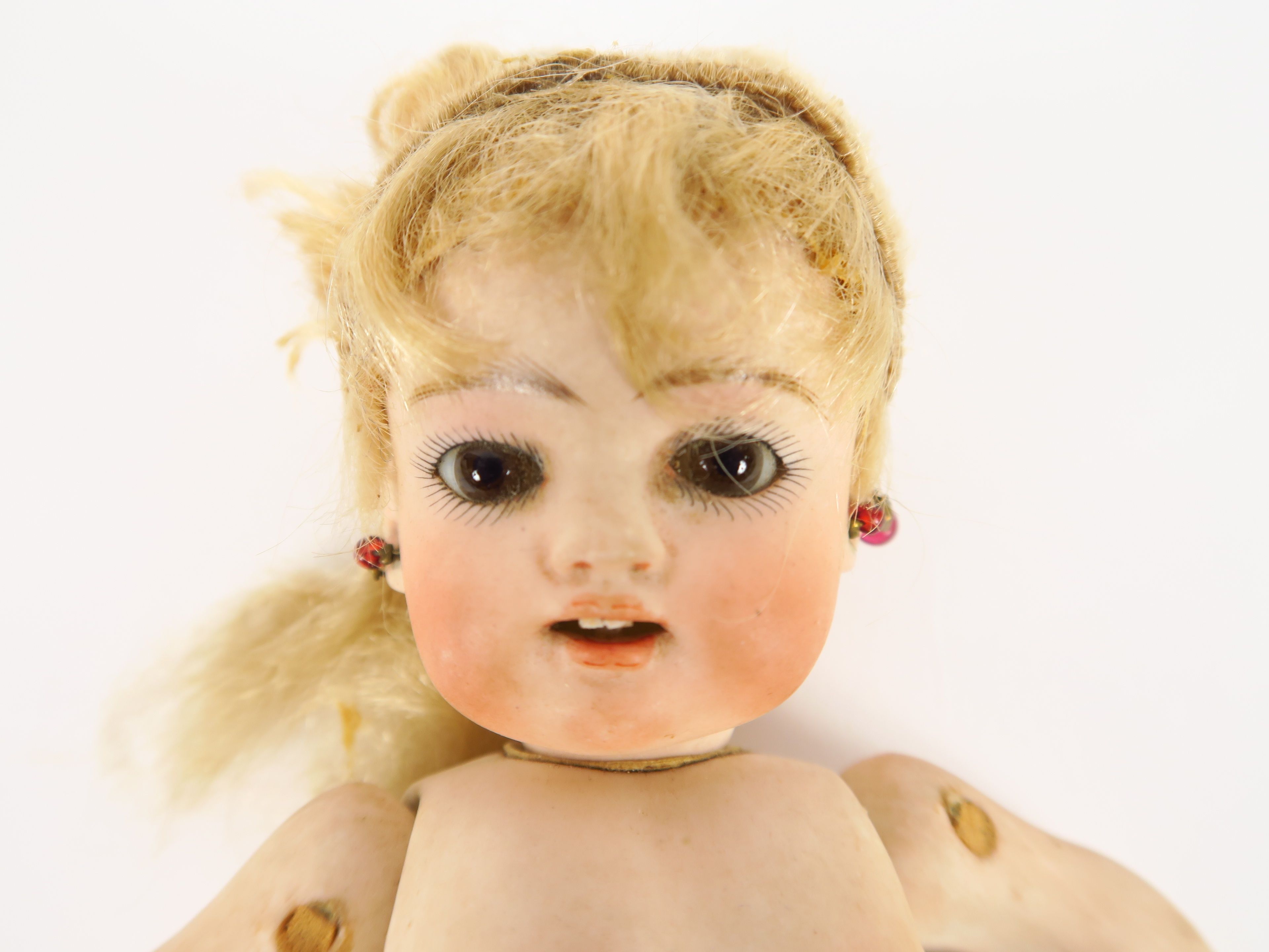 Poupée de marque Kestner 'Allbisquedoll' mignonette, bouche ouverte avec dents carrées, yeux fixes bruns, un bras coudé, bottine noire, très bel état (un doigt cassé). Taille 22 cm