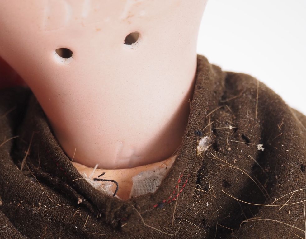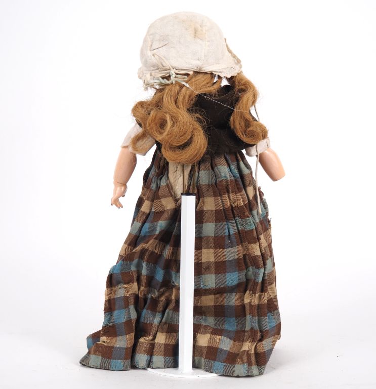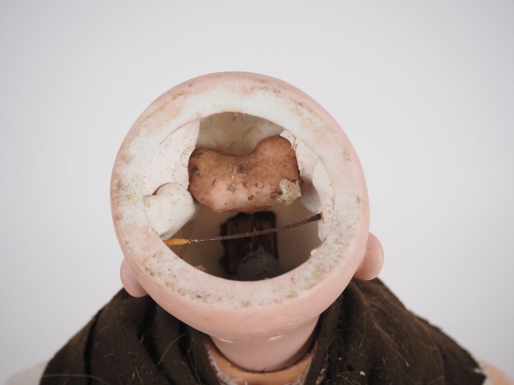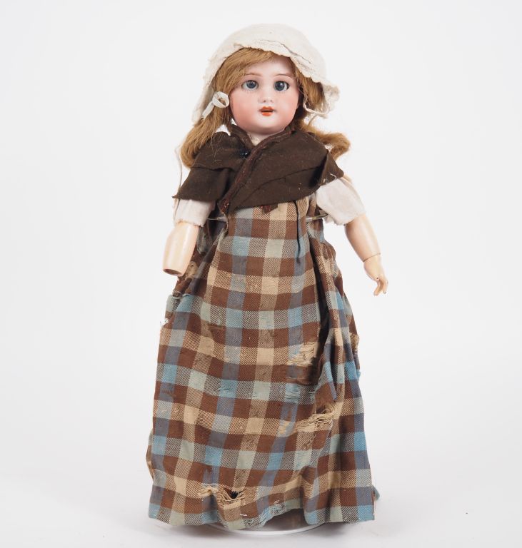 Poupée DEP Simon et Halbig, tête porcelaine, yeux basculants bleus, bouche ouverte, corps en composition, avec une main en moins, perruque et vêtements anciens. Expert : Murielle Auffret